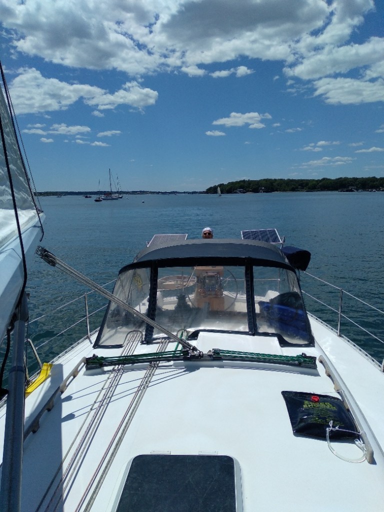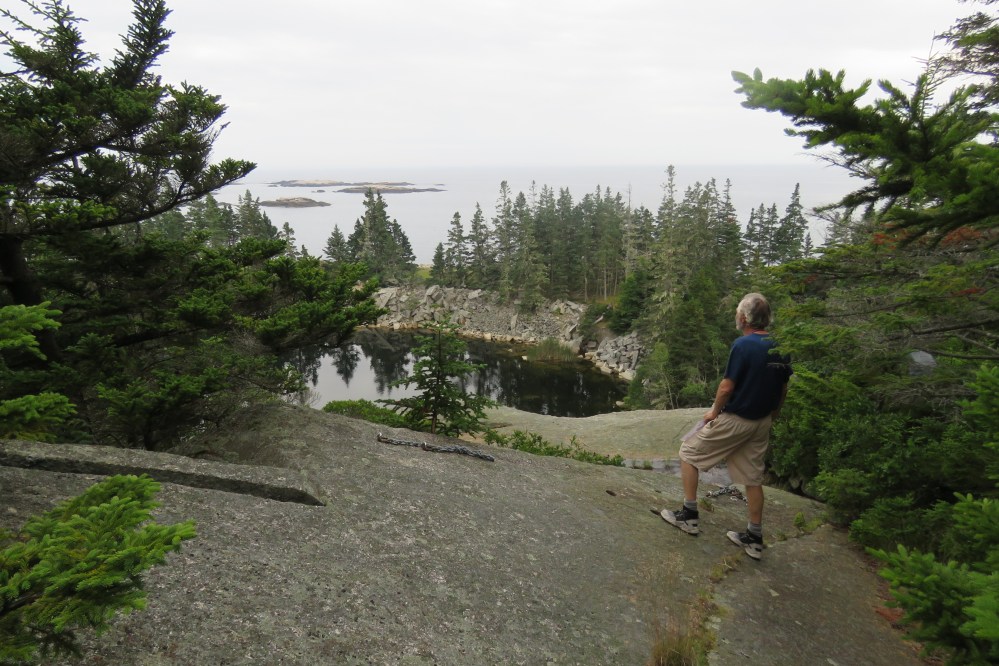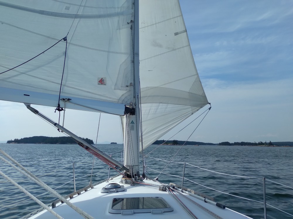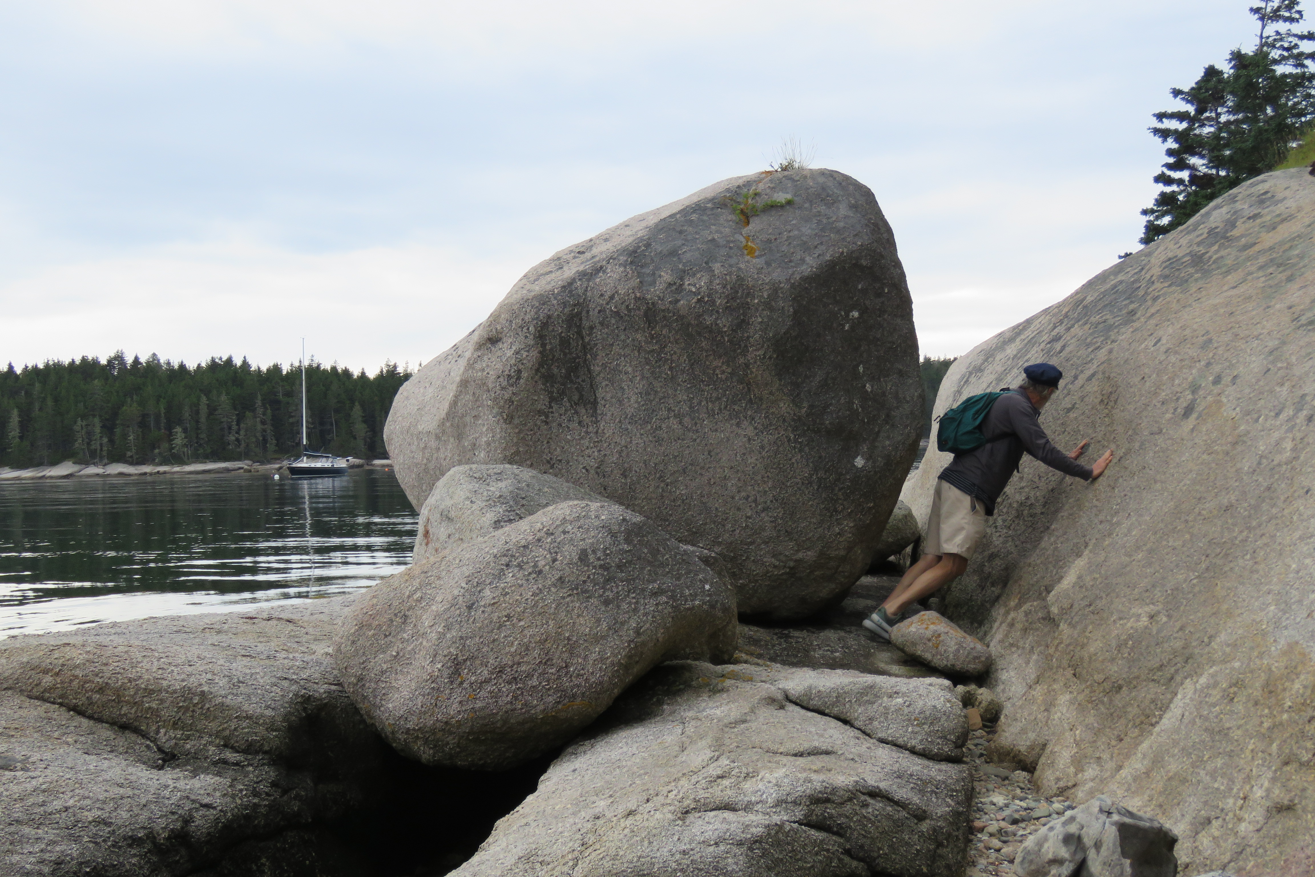 Finally leaving familiar waters, we sailed eight miles across western Penobscot Bay to Hurricane Island, former home of Outward Bound and current home to the Center for Science and Leadership. We went for a glorious hike around the North end of the island to Sunset Rock and back around to the quarry. On the path we met a couple asking, “Do you know where the big crack is?” We weren’t sure but the one we walked through to get to the quarry was pretty big. They too were there on their boat and looking to upgrade, so we gave them a tour of NIRVANA, which they loved and immediately started looking online for one for sale. They subsequently invited us to hang off their mooring in the un-charted Golden Harbor on Barton Island, just outside the Basin on Vinalhaven.