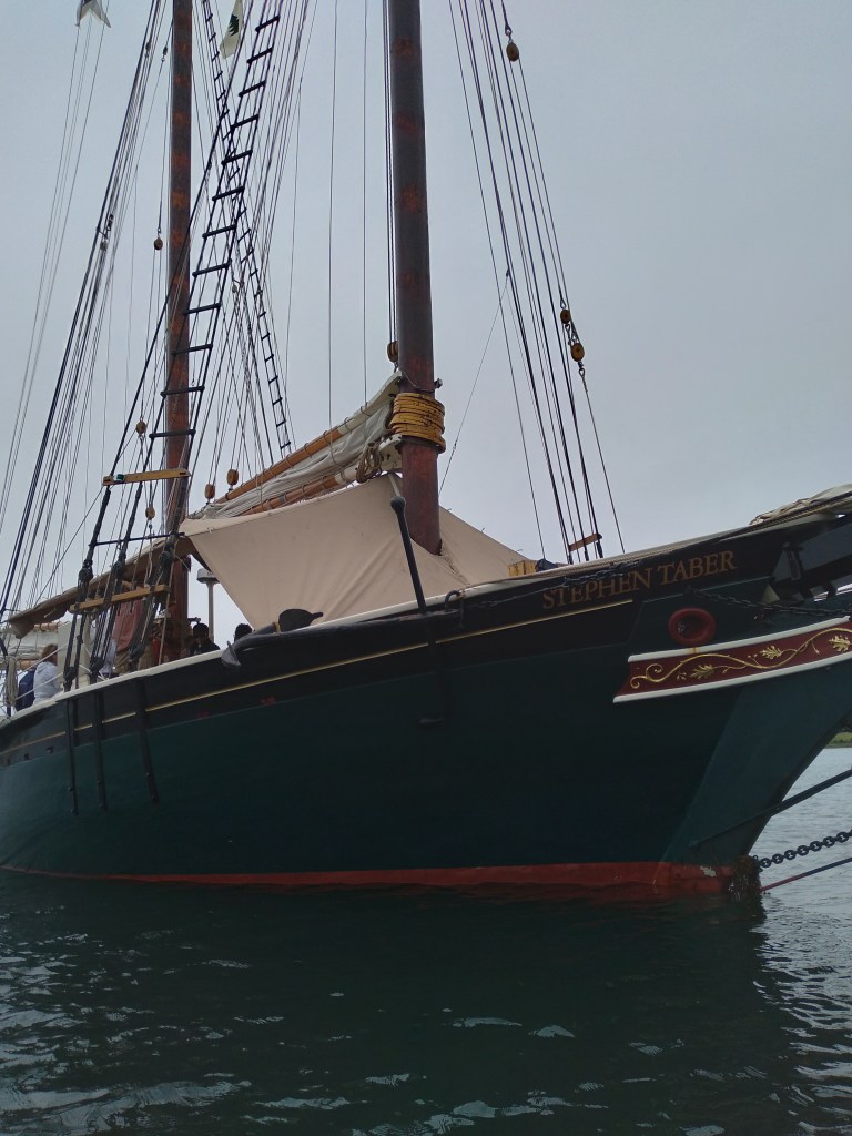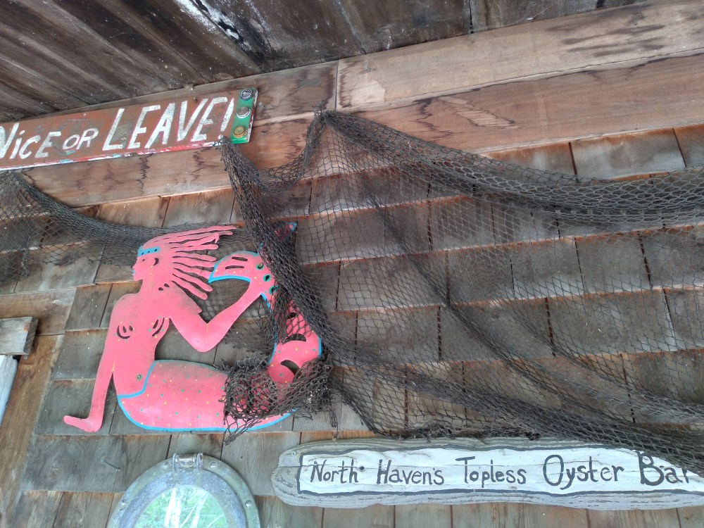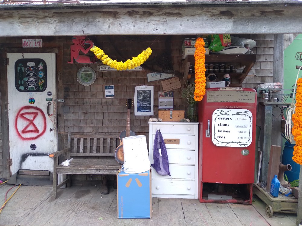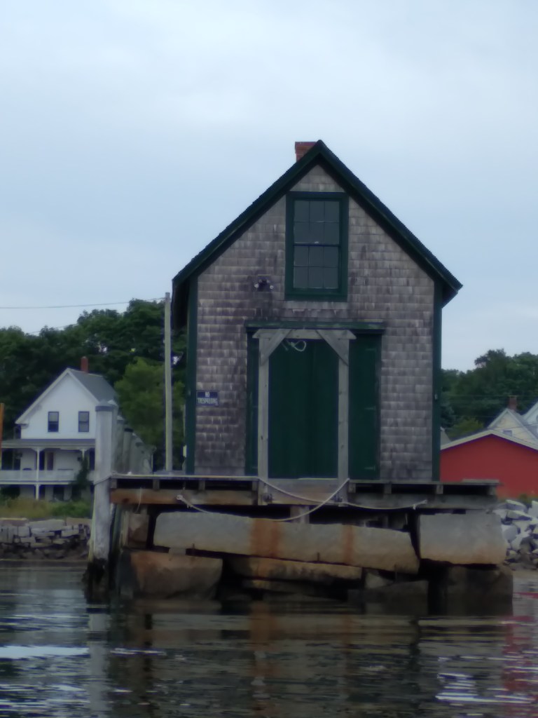 The next day, we rowed up the small river feeding into the harbor to the North Haven Oyster Co. where we bought a dozen oysters from a help-yourself fridge. We were fascinated by the tiny house on a float at the head of the harbor, which turned out to be owned by the Adam, the Harbormaster’s son (how else do you get permission for such a thing?), where he’s been living year-round for the past couple years. Turns out Adam had his own tiny house in Cabot Cove just around the corner, which we also toured with delight as we passed our fourth schooner, the Victory Chimes, on the way out.