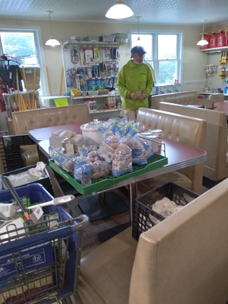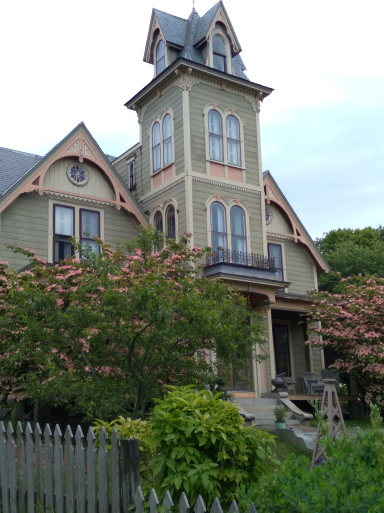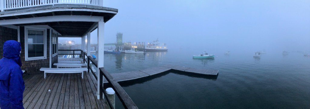What started out as a fine sail turned into pea soup fog as we backtracked past Fiddler’s Ledge into the Fox Island Thoroughfare, a narrow passage between Vinalhaven and North Haven, but we saw no land on either side. After picking up a mooring, damp and soggy, Will said, “Let’s go to dinner at the Nebo Lodge.” So at 8pm, into the fog we went once more, rowing more than half a mile until we found the most elegant farm-to-table restaurant, formerly owned by Chelly Pingry, our State Representative. The food was excellent, albeit small portions for hungry sailors. And who should be there but none other than Annabelle, our dear historical museum guide! Not much for a young person to do on these small islands, so you kind of do it all.