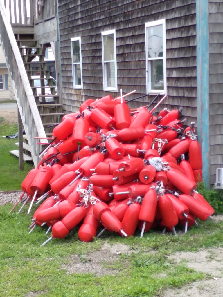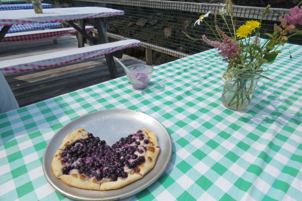 The next day, the fog was still too thick to make a hike in the outlying Acadia National Park worth it, so we sailed 18 miles across Jericho Bay, past Swan’s Island to Frenchboro (Long Island), where we spent two wonderful days on the most remote inhabited island yet. In 24 hours, we’d met probably half the island, among them Eric, a recent transplant who lived in the oldest house on the island and gave us a tour of his unusual “Joshua” ketch and the book he wrote about his solo voyage to Hawaii; John, who used to run Lunt Lobster and Deli and made us a to-go sandwich after a tour of his cottage; Daniel, the lobsterman who gave us a detailed explanation of the nuances of a lobster trap; Daniel’s wife, one of the three members of the selectman’s board who made us each a lobster roll on the spot; the twice-a-month tax man at the town hall who gave us the inside scoop on all the properties that owe back taxes; Jen, the pastor turned chef of the Deli, where we had among other things, blueberry pizza (try it with ricotta!); Rick, a friend of Will’s from Concord with whom he’d played soccer for 15 years; and Zach and Nate Lunt, who 25 years ago, did a video with my mother when they were in grade school and who showed us the whale bone they collected and their huge stuffed moose! It was a very special place with not much to do except walk around the island and enjoy the slow-paced beauty of island life.