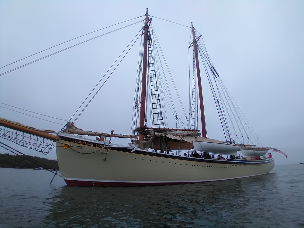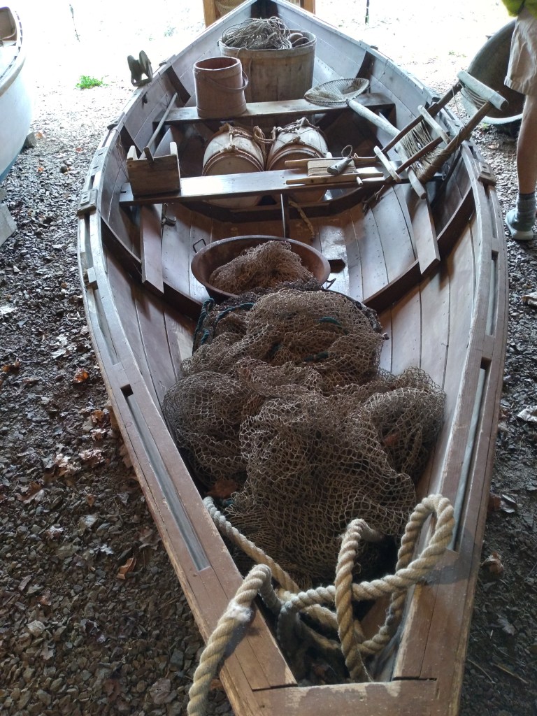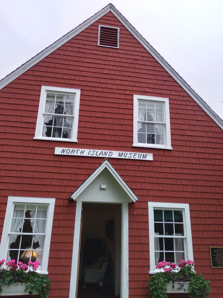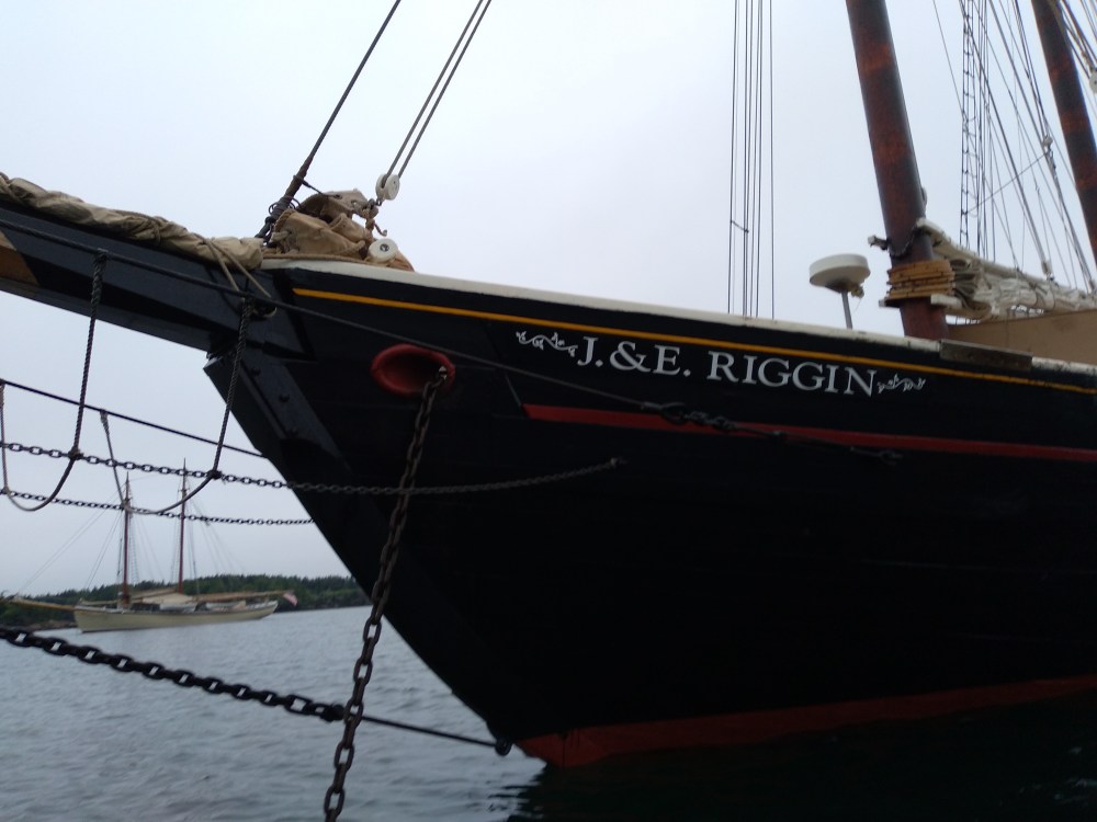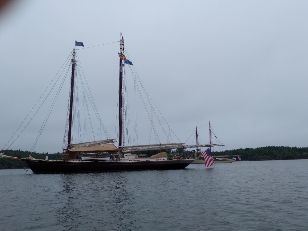 From there, we headed out past Leadbetter Island on our way to Pulpit Harbor on the north side of Northhaven, where we spent two nights. Our first mission was to fill our propane tank, which we schlepped a couple miles to a guy who would be able to fill it at 4pm. That left the rest of the day at the fascinating North Haven Historical Society museum, with excellent exhibits of early sailing and working skiffs, farming, schooling, and life on North Haven, complete with local commentary by Annabelle, the sweet 18-year-old whose goal is to run the place, after college at USM. The museum had one of the original North Haven racing dinghies, the oldest one-design racing boat still being raced today. Luckily, a passing truck took our trash to the dump on our walk in, and another passing truck gave us a lift back to the harbor with our propane and groceries on our walk back. And what should be our delight in the harbor, but not one, not two, but three gorgeous schooners—Stephen Tabor, American Eagle, and my favorite, J&E Riggin, which had aboard a knitting-dancer I’ve danced with in Camden! Rowing around these awesome boats was a thrill, and to top it off, we were invited aboard a custom motor yacht we both recognized from Casco Bay for a glass of wine and tour.