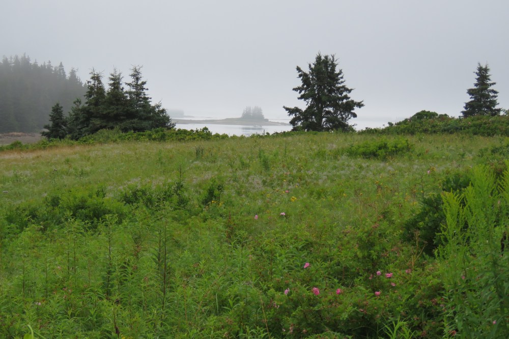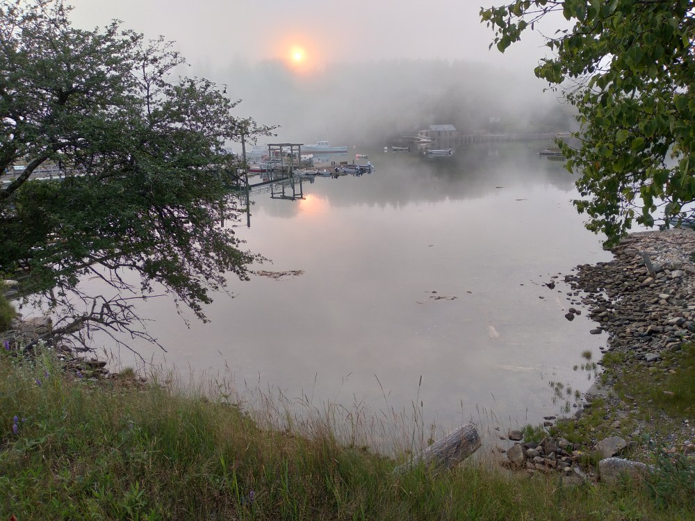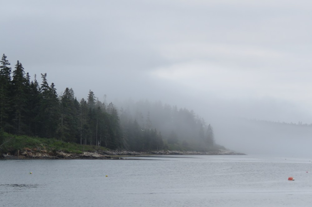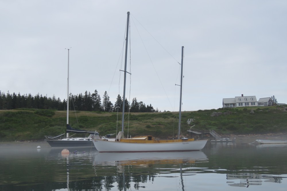 Despite the ongoing “patchy drizzle” and fog as reported for days on end by NOAA, we decided to motor a short three miles from Merchant to Isle au Haut, where we picked up a mooring just off Kimball Island. It turned out to be owned by none other than the Kimball’s, but we were assured by a local fisherman we’d be fine. Wandering ashore in our rain gear we visited the small gift shop, chatting with the owner and her husband for nearly an hour; the town hall/library, complete with a tour by the proud librarian; the church up on the hill; the Acadia National Park ranger station; and the well-stocked grocery.