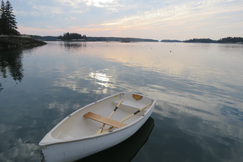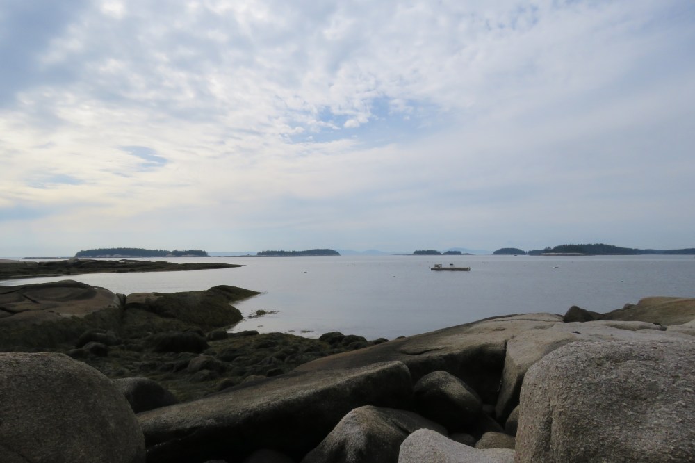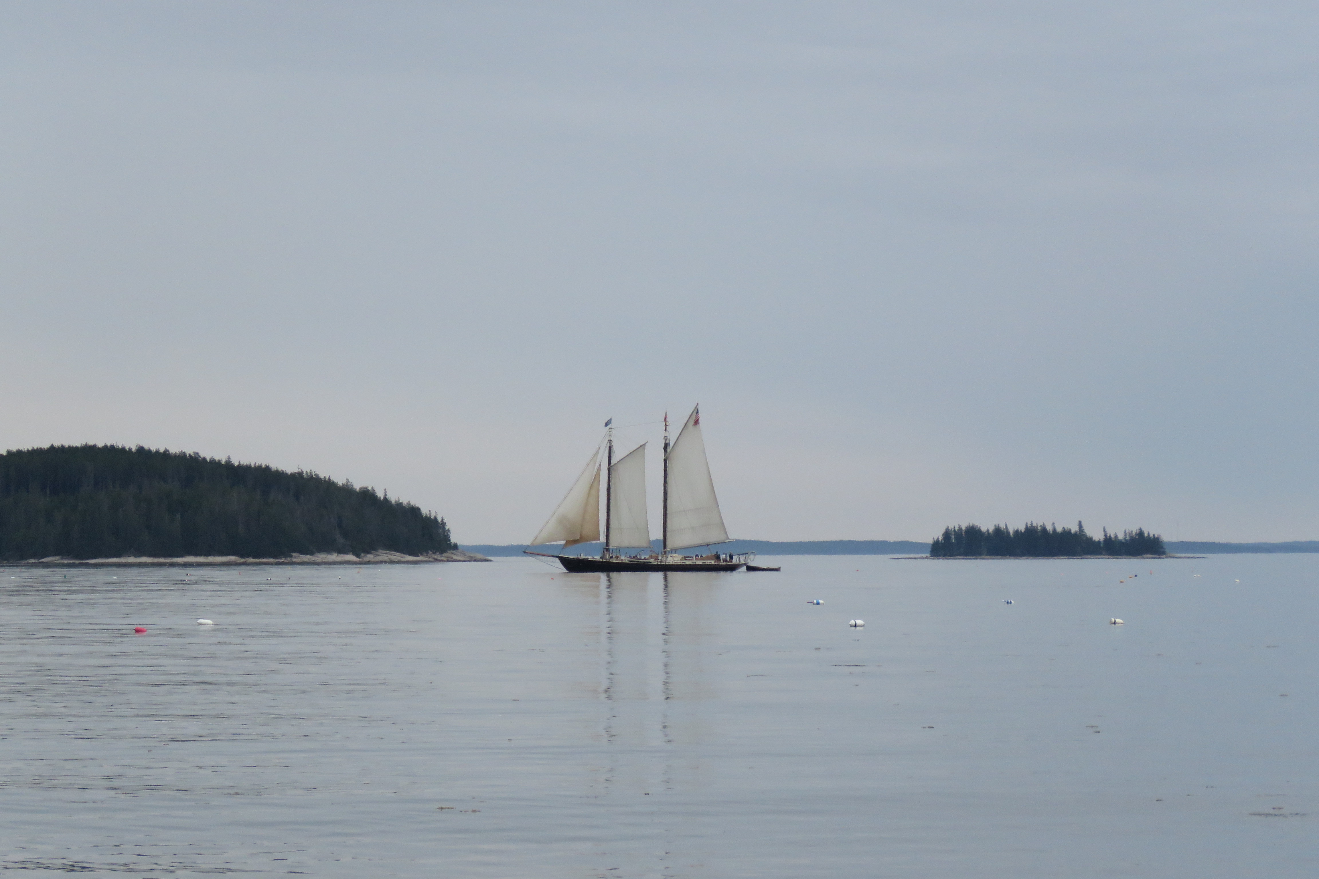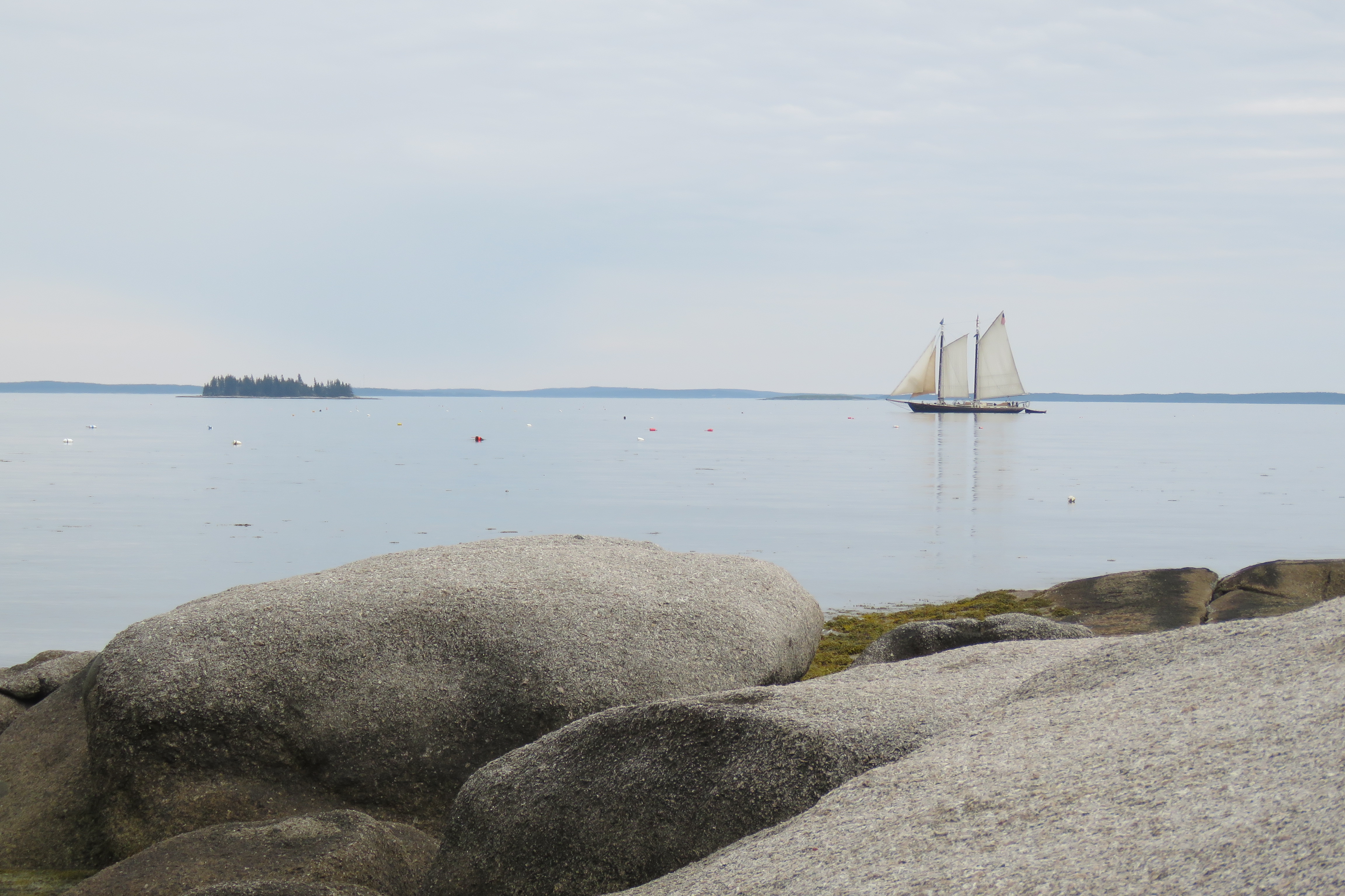 Around the corner was the beautiful Perry Creek where we sought out yet another floating tiny house (we totally want one!), but just as we were settling in, we simultaneously realized we’d prefer to take advantage of the wind and sail, we didn’t know where. We had an exhilarating reach in 10-13 knots where we hit 8.4 knots, out the eastern end of the Thoroughfare, across eastern Penobscot Bay to Merchant Island, one of the largest islands south of Deer Isle. Picking up a giant mooring, we discovered mussels growing on the pennant, which we harvested and ate for supper with garlic and wine. Will’s comment, “So that’s what mussels are supposed to taste like!” The next day, we rowed ashore on the adjacent Harbor Island where we saw the J&E Riggin sailing past in a picture-postcard view and had a picnic on our own private crushed shell beach. Ohmy! Our second favorite island so far.