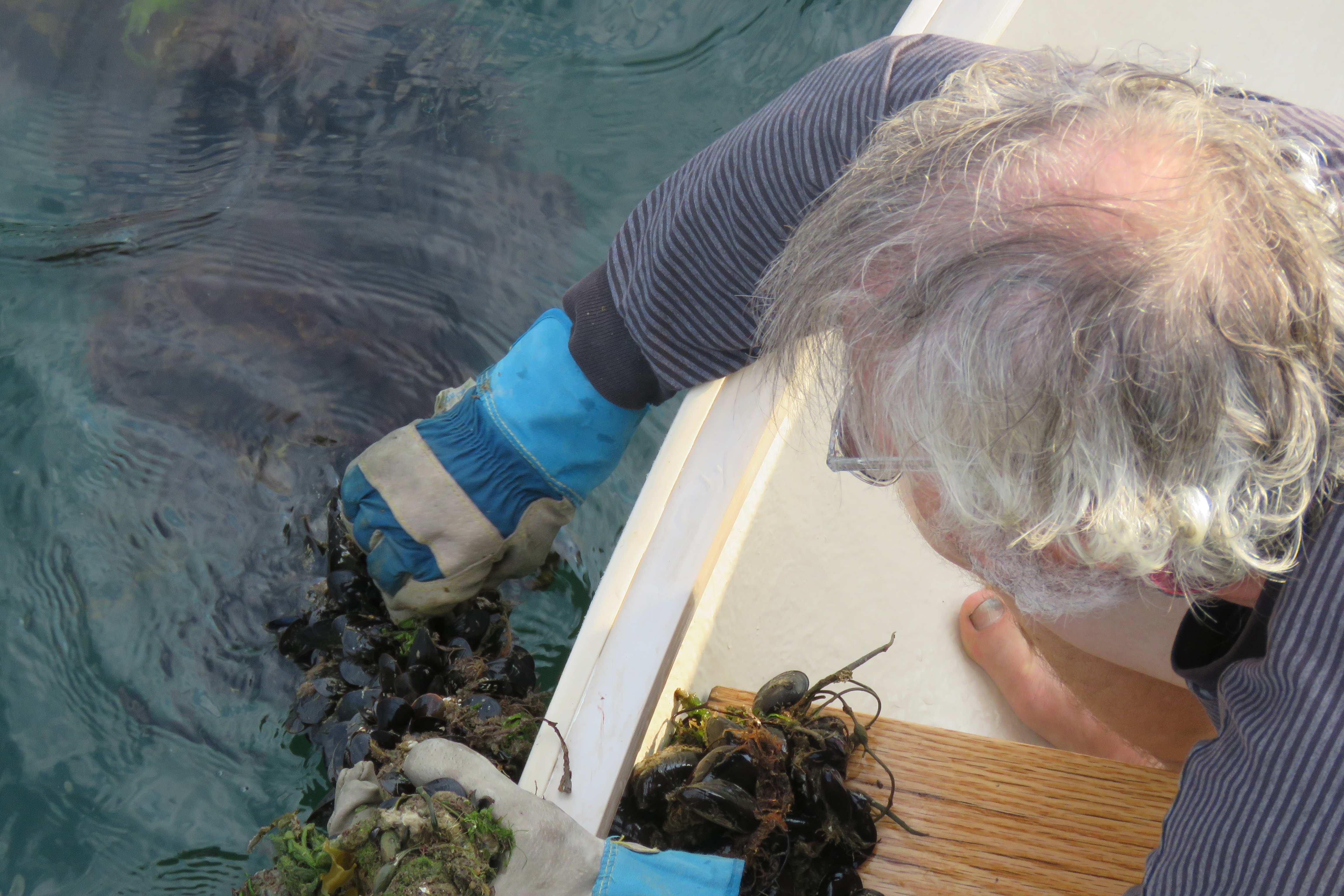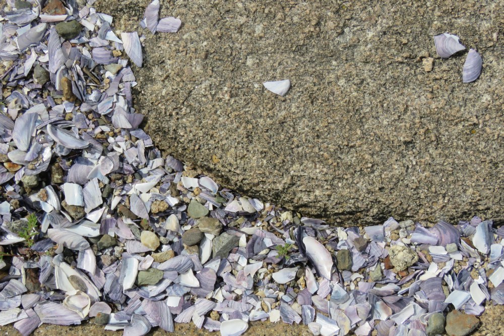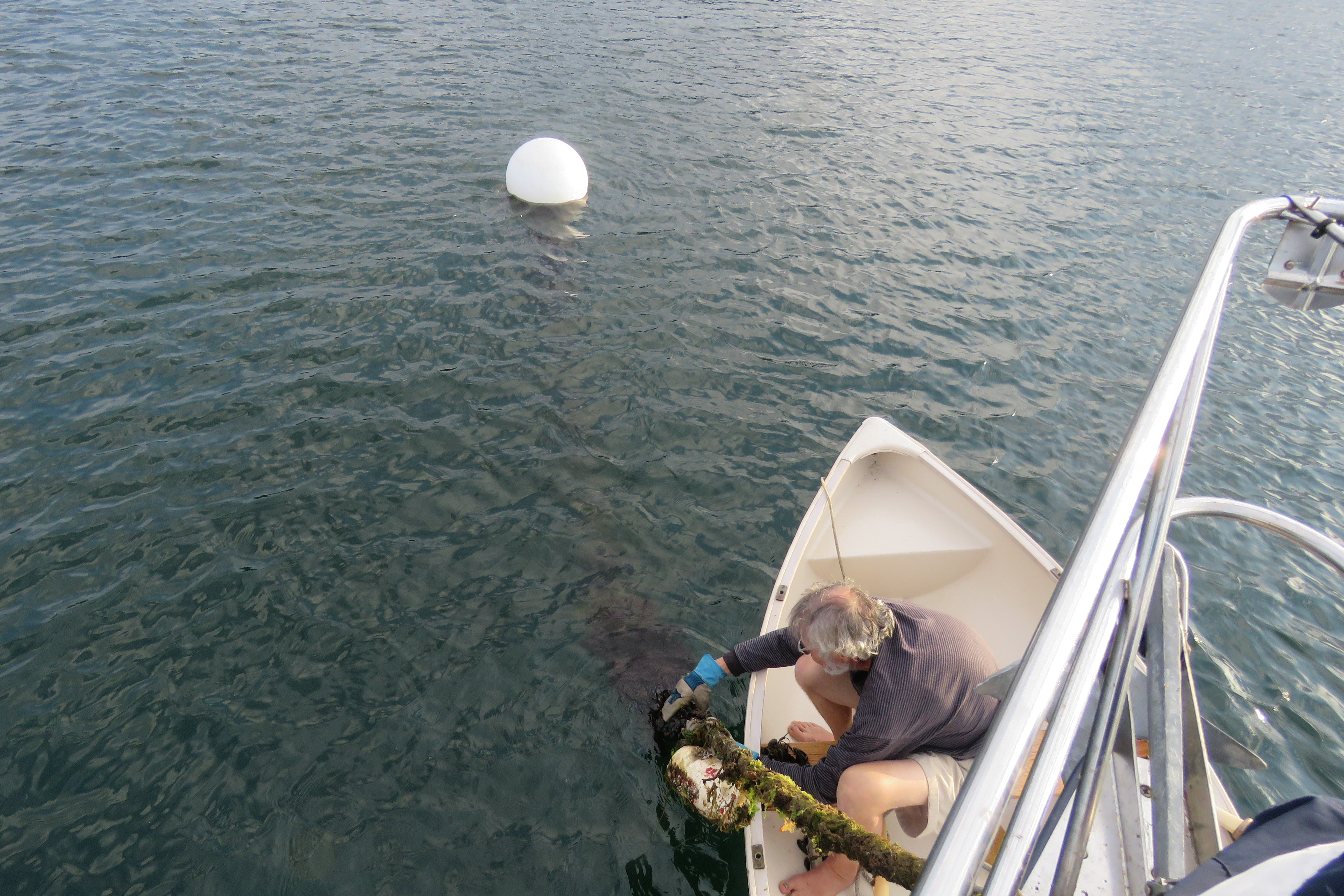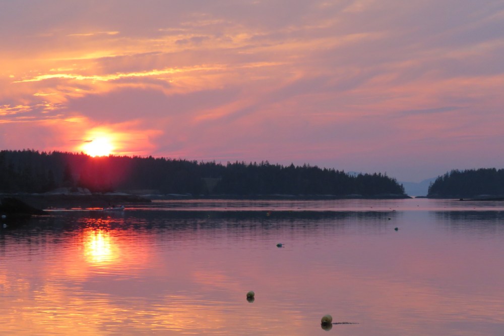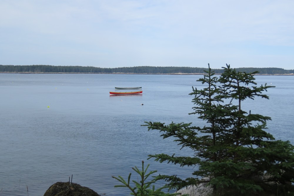 Around the corner was the beautiful Perry Creek where we sought out yet another floating tiny house (we totally want one!), but just as we were settling in, we simultaneously realized we’d prefer to take advantage of the wind and sail, we didn’t know where. We had an exhilarating reach in 10-13 knots where we hit 8.4 knots, out the eastern end of the Thoroughfare, across eastern Penobscot Bay to Merchant Island, one of the largest islands south of Deer Isle. Picking up a giant mooring, we discovered mussels growing on the pennant, which we harvested and ate for supper with garlic and wine. Will’s comment, “So that’s what mussels are supposed to taste like!” The next day, we rowed ashore on the adjacent Harbor Island where we saw the J&E Riggin sailing past in a picture-postcard view and had a picnic on our own private crushed shell beach. Ohmy! Our second favorite island so far.