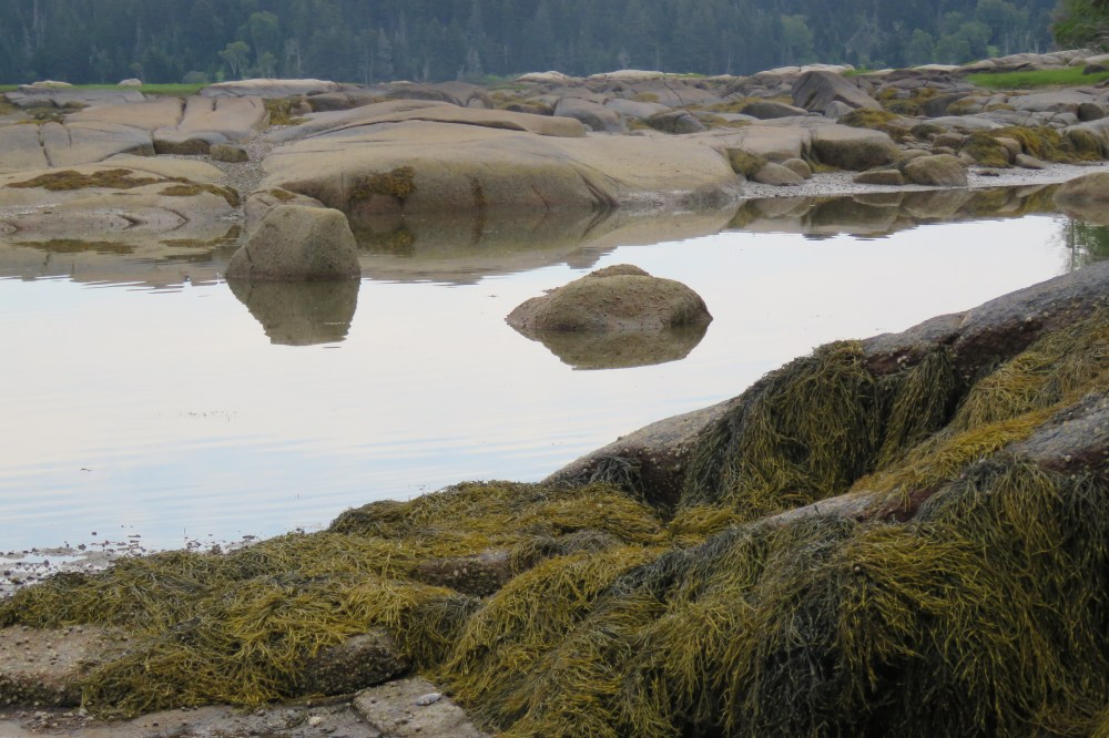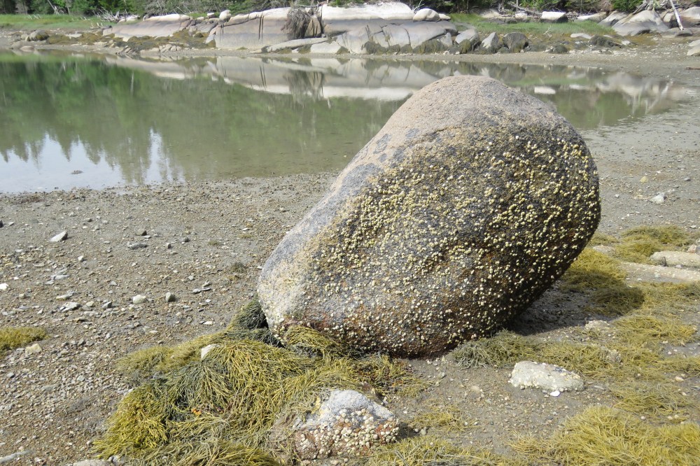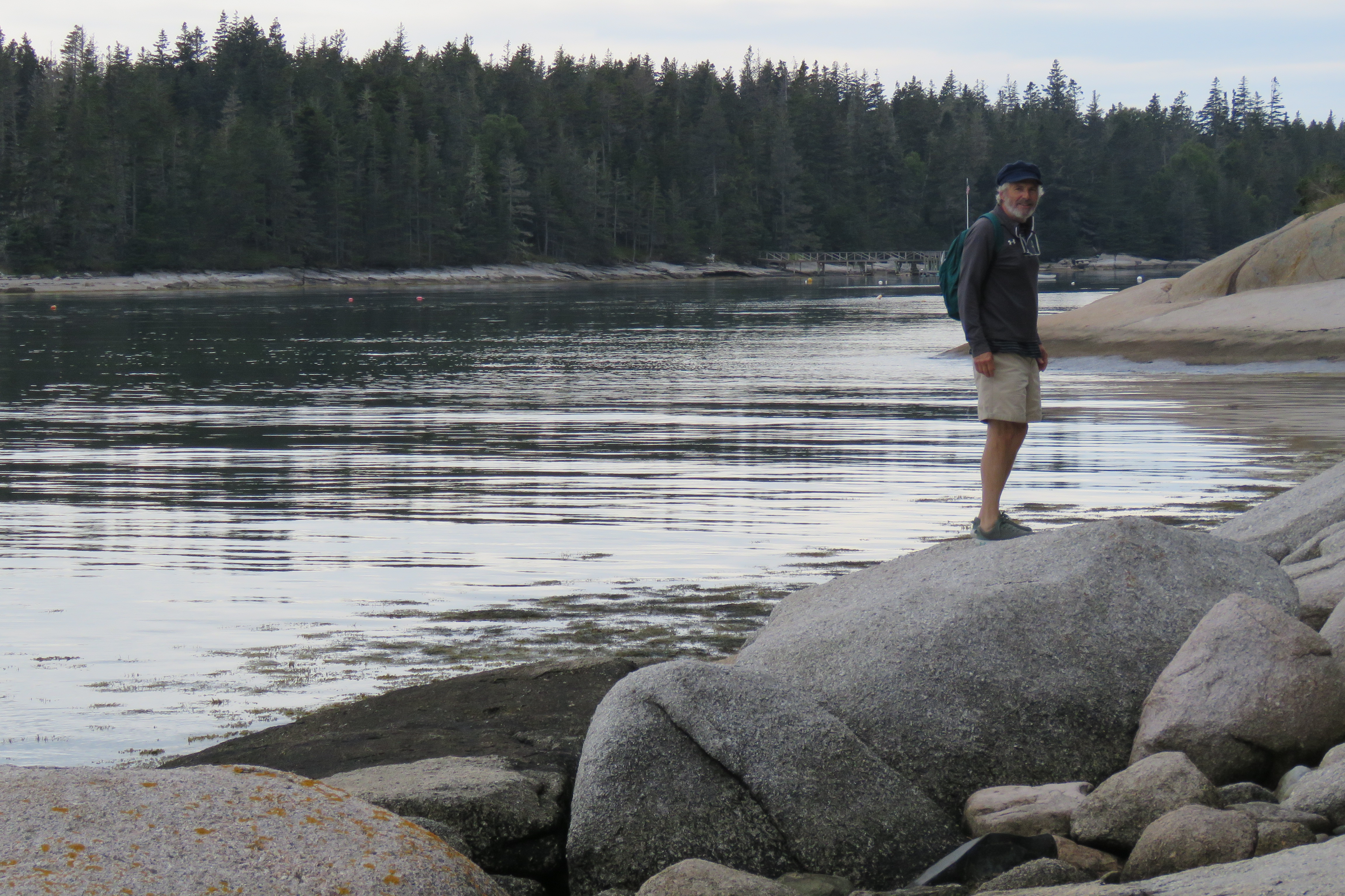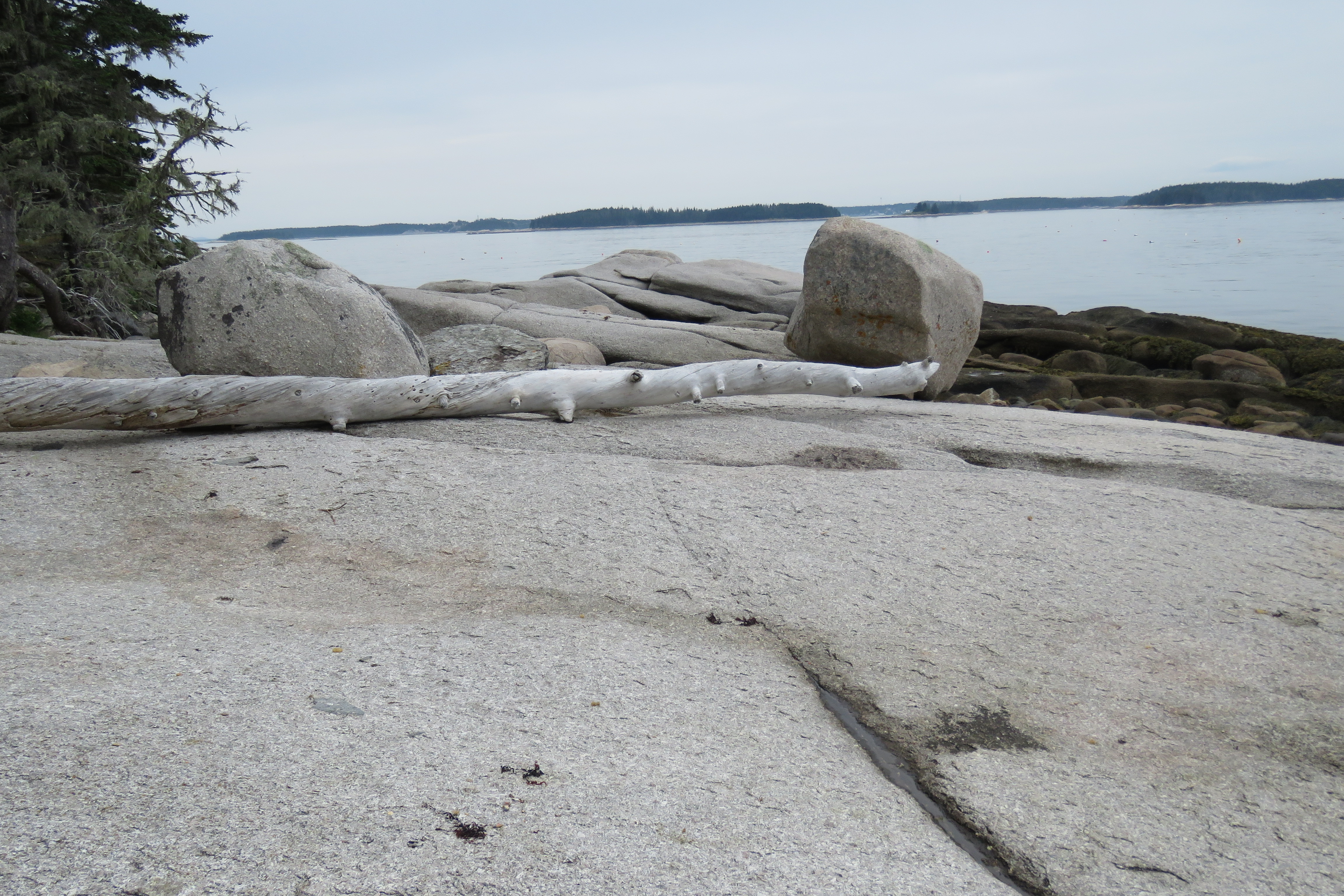 After spending the afternoon in Carver’s Habor, the main harbor on Vinalhaven, where we anchored in 3’ at low—two hours before and after high tide—we had a delightful sail wing-on-wing out the Reach where we encountered a huge ferryboat in the narrows! We didn’t dare go into the Basin with our boat but tried rowing at an hour after low tide, but it was impossible. The Basin is a huge inland body of water where the tide rushes in and out through a very narrow passage twice a day. By good fortune, we were invited by our friend’s cousin on the adjacent point to walk their private path to the public trail, where we had a long walk around and where we saw a rock with more than 20 seals. A fascinating place indeed!