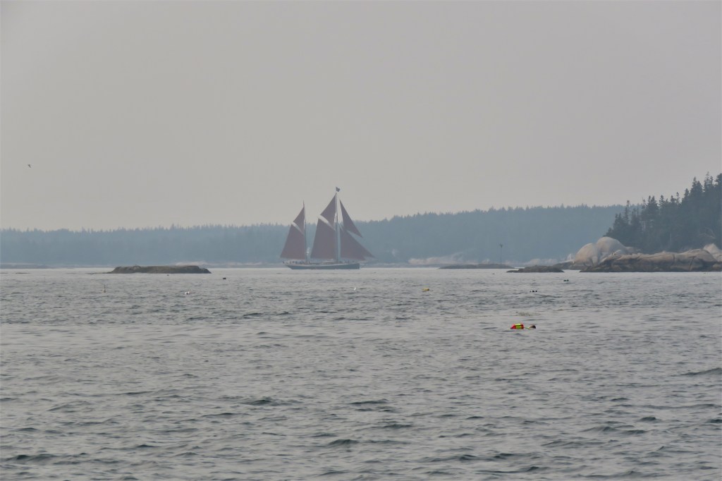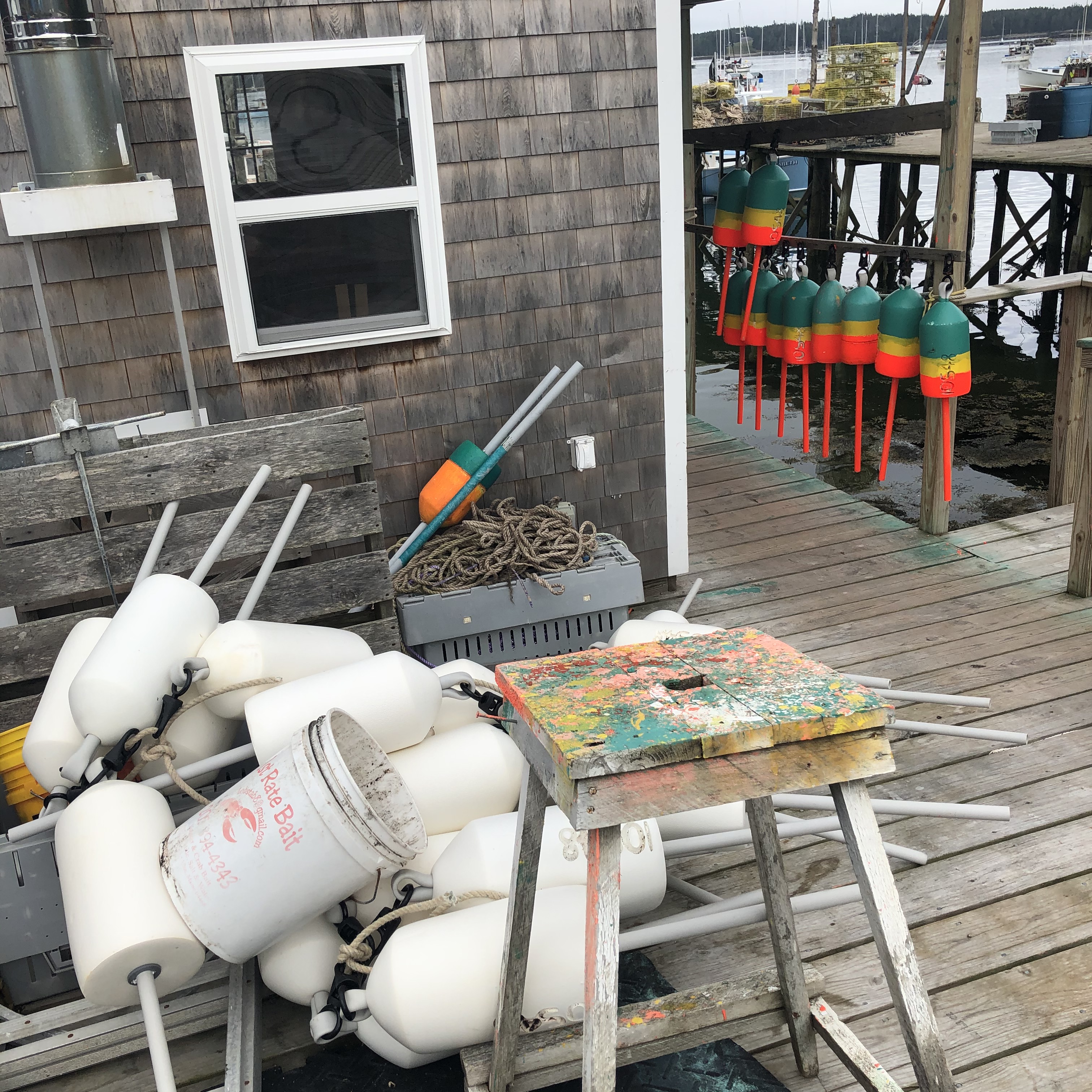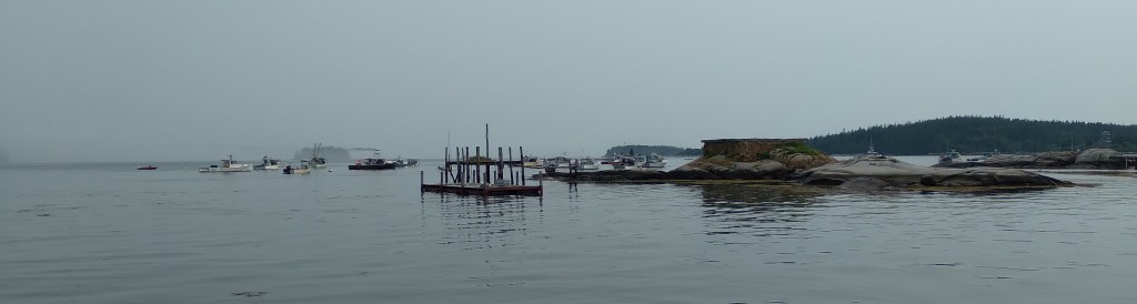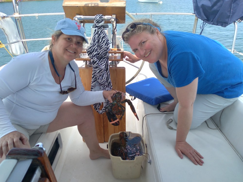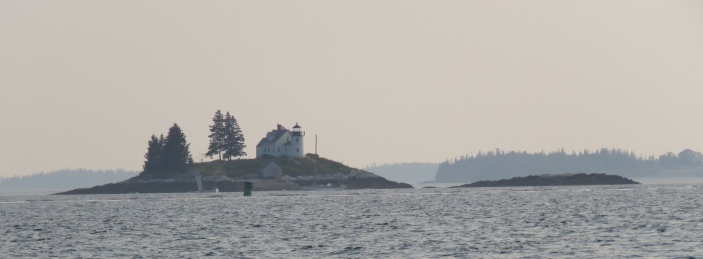 Another major hazard of sailing in Maine waters is the ubiquitous lobster pot, a colorful floating buoy attached to a four-foot lobster trap on the bottom. Because they’re easy to snag on the rudder or propeller, we make every effort to steer around them, which means we have to be super vigilant. Depending on wind and tide and despite you best efforts, you can slide into them and get snagged. Not only that but many lobster pots are attached to another buoy with a toggle line between them that may only be several feet below the surface, so identifying pairs of connected pots is also a required skill. Alas, while we’ve avoided thousands of pots so far, we have in facts snagged and unfortunately had to cut the line of one pot and one toggle while underway, which is quite a trick. While we feel somewhat badly for the lobsterman whose trap is now lost on the bottom, we know that lobstering has been the most lucrative in 40 years, so we carry on. We’ve also learned that there’s an escape hatch on the traps so lobsters can pretty much leave when they choose.