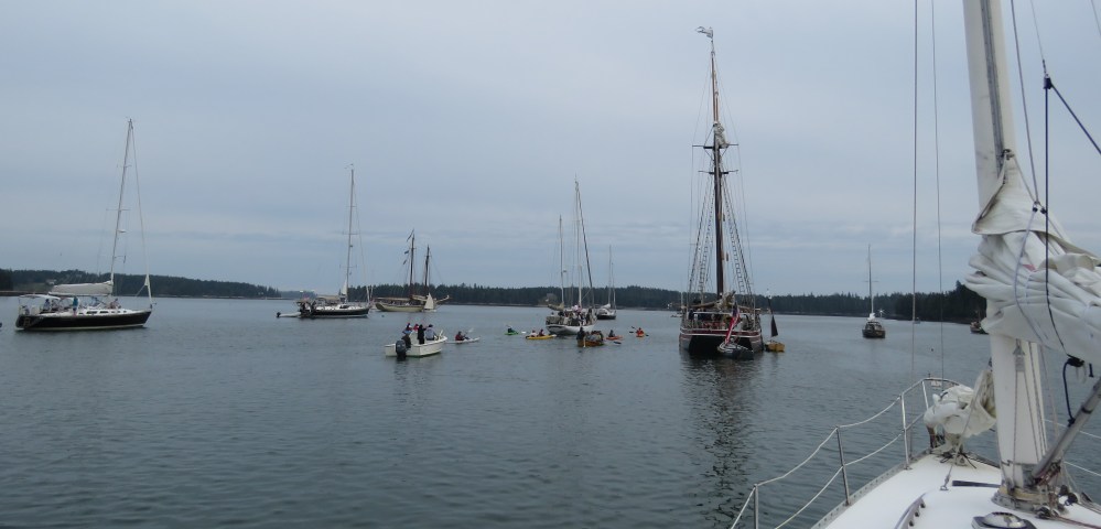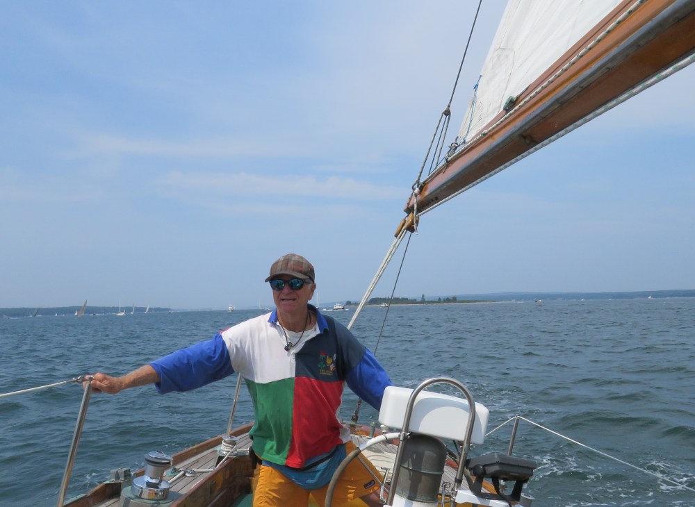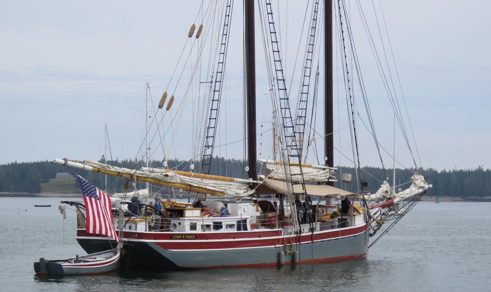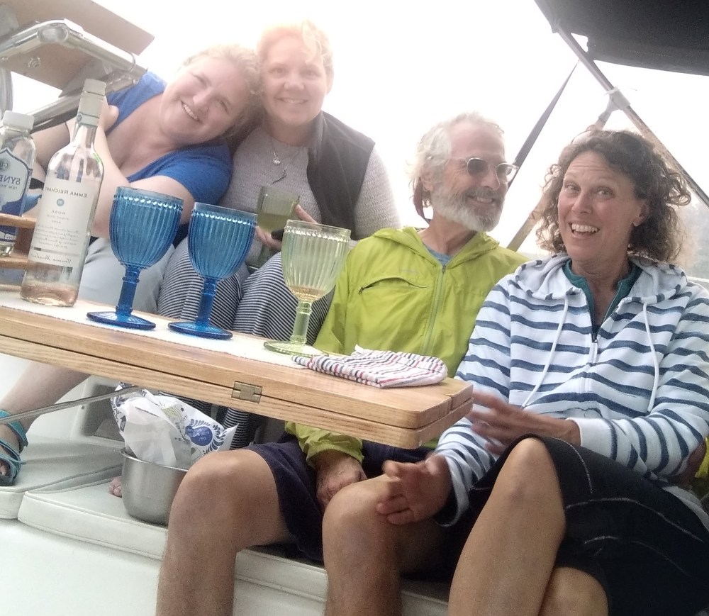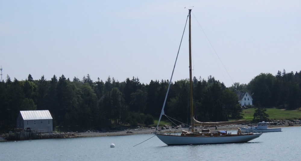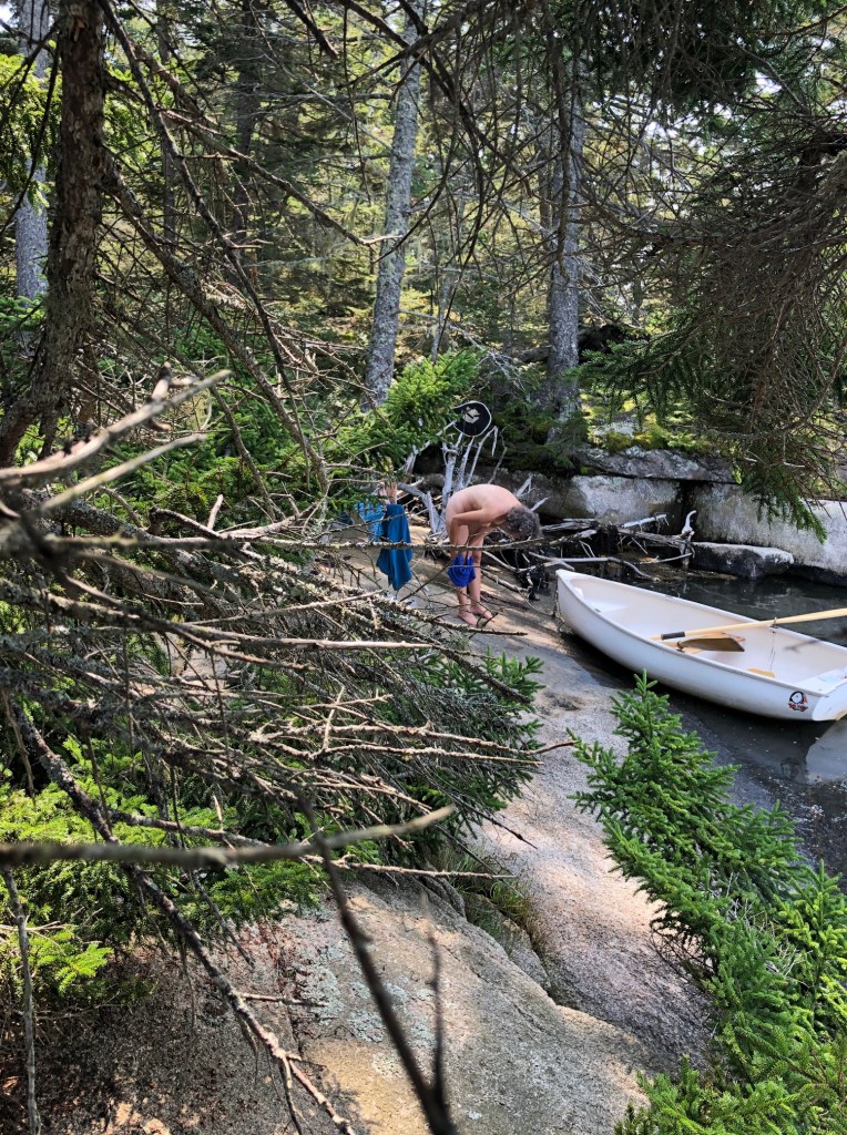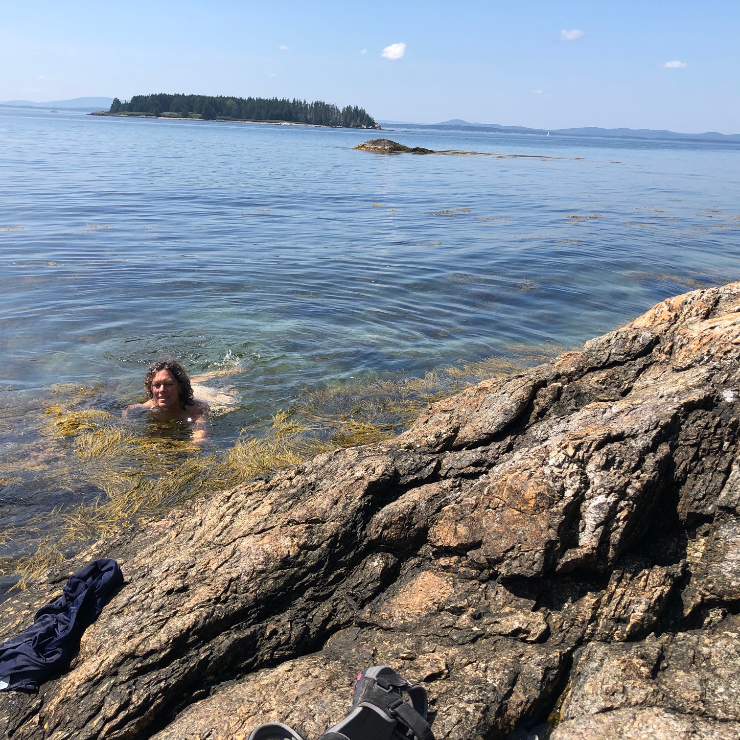 Settled in, thoughts turn to cocktail/vape hour and supper. Tasha is a very imaginative chef. Most nights she prepares something she has not made before, and it always comes out amazing! Last year’s nine-day cruise saw us sitting outside every evening for supper and a gorgeous sunset light show. Whether due to heavy rains this year or something else, the mosquitos have largely shut down that option. Instead, we take in our solar LED lights from up on deck to our fold-down table in the salon and enjoy a candlelit supper. We benefit from having a heat exchanger in our engine such that often we get to wash dinner dishes in hot water, unless we’ve already used it for hot showers. We’ve also used our camping sun shower—a black plastic bag and spray nozzle that heats up in the sun—both on deck and in our head for less luxurious but still hot showers. Sometimes we augment the hot water in the solar shower by heating some on the stove. These hot showers have been deliciously satisfying, only exceeded by the three lengthy ones we’ve had ashore. Another shower alternative is a quick saltwater dip in the ice cold Maine ocean followed by a warm water rinse from the hose in the cockpit. The outdoor showers are heavenly, especially when we have privacy from other boats. Sailing done for the day, we often play music, dance, sing, read out loud to each other from our small library, do the New Yorker crossword puzzles with some success, play Boggle, write in our journals, play keyboard and guitar, or just plain veg! Even on cold, rainy days when we’re sitting at anchor, we’re never bored.