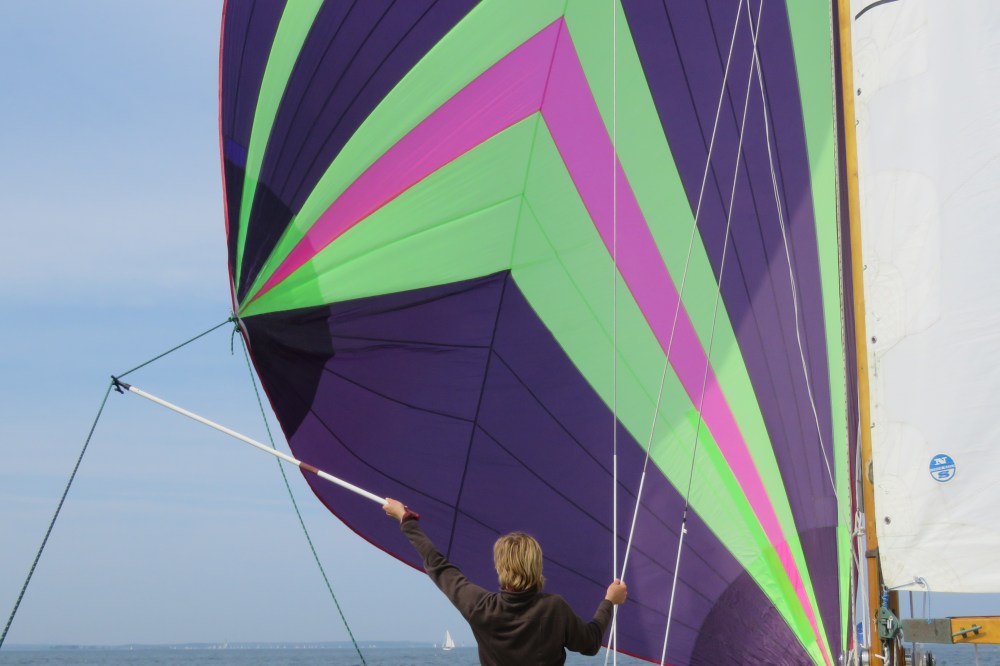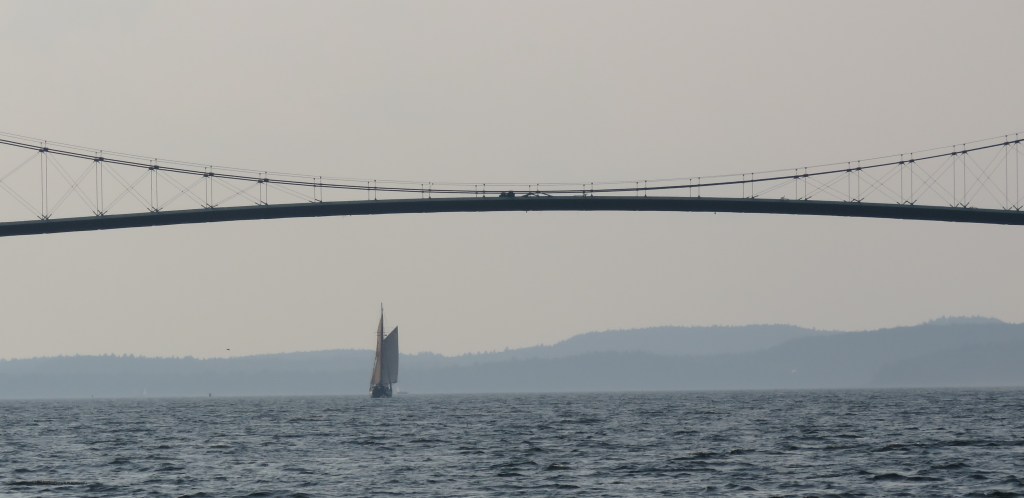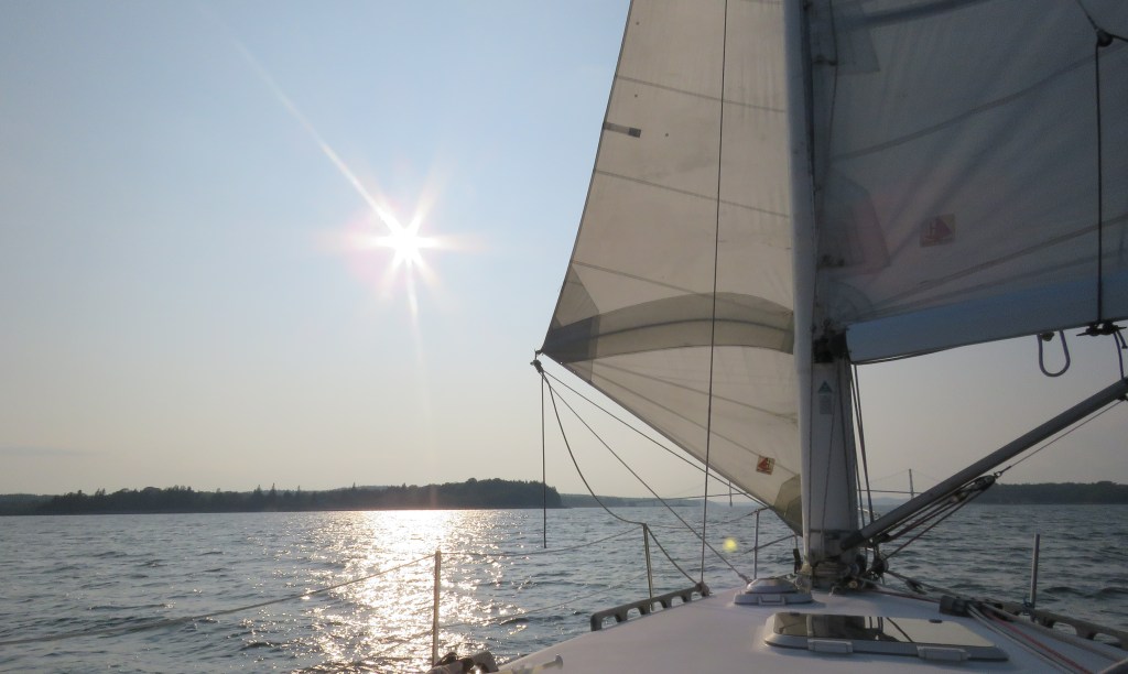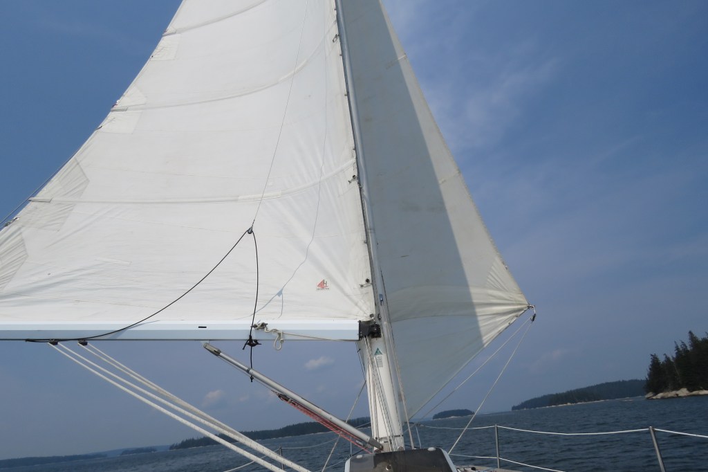 We look on our phones at the weather reports from various sources for information on wind speed, direction, tides, rain, etc. and decide whether we have favorable wind for a new destination that day. Our sailing passages have been in the range of 10 – 20 miles, which we can do in a handful of hours. However, the wind forecasts have been so erratic that plans B, C, D, and so on are often accommodated half-way through a passage. While we can sail upwind, it’s much less efficient than all the other points of sail if we really care to get somewhere, which most of the time we don’t. Our boat is very easy to sail given its self-tacking jib and all lines leading back to the cockpit. This means that while sailing, unlike mooring, anchoring, or docking, the boat can easily be virtually single-handed. That said, there are definitely times when having two is much easier. We begin our sail by starting the engine, pulling up the anchor or letting go of the mooring line, and while one of us is steering out of the anchorage, the other is removing sail ties and loosening our halyard and reefing lines, which we tie up for the night so as not to keep us awake with their clanging above our heads on the mast. Because the jib is so small, this means the mainsail is very large and heavy, so Will usually hauls up the sails while Tasha steers into the wind, then we shut off the engine and sail away.