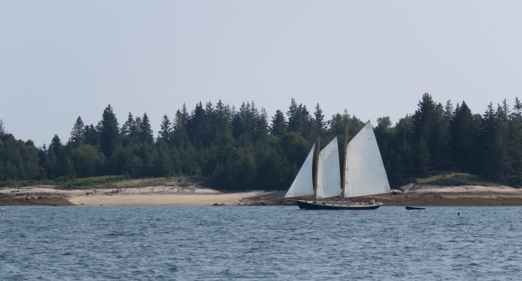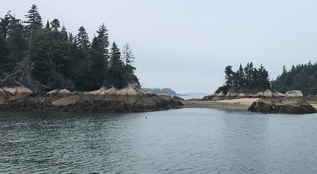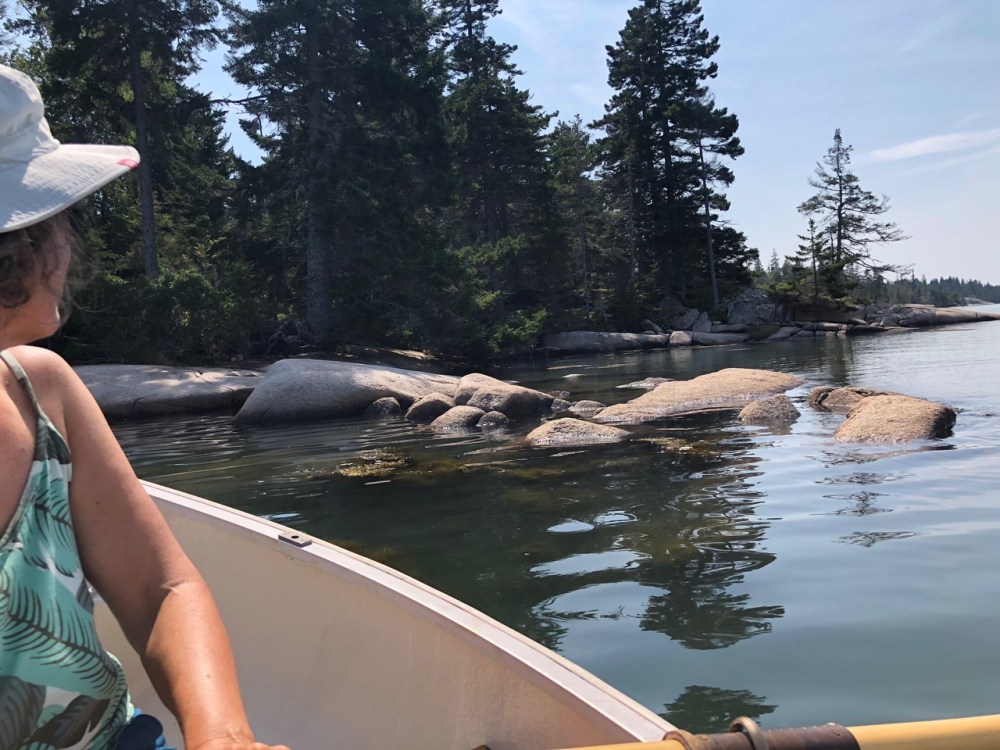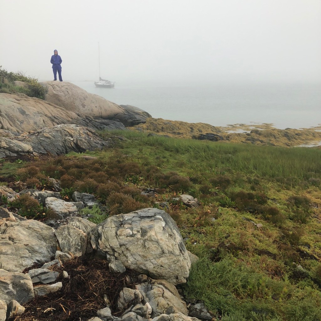 Once arrived, we often row ashore in our Puffin dinghy that is tethered to the stern that we tow behind us when we sail. We pull the dinghy up alongside the boat, bail it out, if necessary, put our day pack aboard, and climb down with the assistance of a single rigid step suspended from the toe rail. No, Will has yet to install the pully system to hoist the dinghy up on the davits at the stern. We both love to row and have easily rowed a mile a more at a stretch. The Maine Island Trail Association has created beautiful trails on many uninhabited islands. We prefer the islands with the least man-made impact and love the nature and variety such that no two islands seem alike. We’ve bathed at, danced on, and photographed many of these islands and have been awestruck by both the large-scale vistas and the up-close view of the wide variety of fauna we’ve encountered. Tasha has likely prepared snacks and water, and we often carry extra clothing, which we end up not needing since it’s usually about 10 degrees hotter on land with fewer breezes. We’ve also especially enjoyed the more remote island folk that we’ve met, and we might spend the day chatting up locals who are more friendly the more remote the island is.
