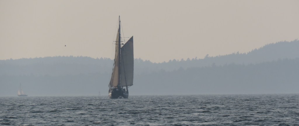 While underway, we’ve encountered the wind changing direction and faltering as well as strong currents coming right at us that have made us change our mind mid-course about our next anchorage. Some of these have been wonderfully fortuitous as the cove we ducked into was much nicer than we expected or the guidebook might have commented on. Navigating on-the-fly requires an appreciation of which land masses will best block the wind that night so that our anchorage is not only secure but as calm as possible for sleeping. As much as we admire people like Bill Cheney and his engineless boat Penelope whose book we’ve been reading, we don’t sail up to our anchorage. Rather, with plenty of room to spare, we start the engine, drop sails, and motor until we find the best spot. One thing we learned from Belfast Harbor is that if you are not on route of lobstermen leaving early in the morning, you get to sleep much later in the morning!