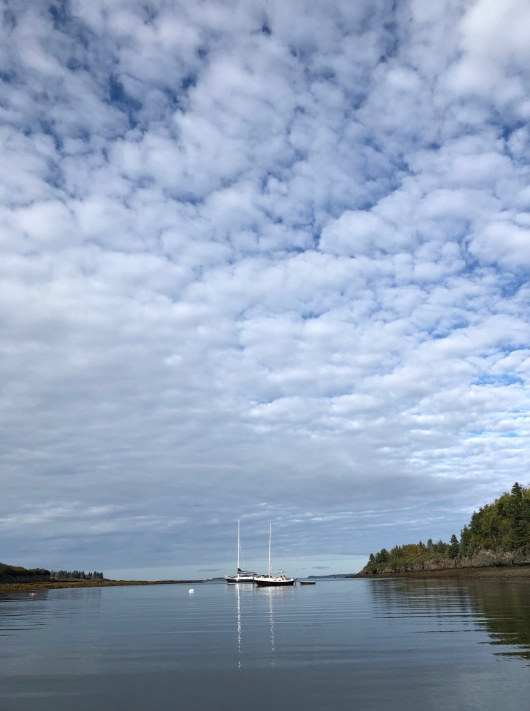 Having sailed by it many times, we decided to pick up a mooring at neighboring Chebeague Island, one of the largest year-round inhabited islands in Casco Bay. I reached out to Eliza who has a house there and whom I’ve met a couple times through a friend. On our walk around the island, we met several people who knew her and finally made contact. She directed us to her house through the woods and met us on the path, which took us by two yurts that she rents of AirBnB, one of which is an authentic Mongolian yurt (https://airbnb.com/rooms/50666392). The island is also home to the famed Chebeague Island Inn and restaurant, where we had a wonderful meal on the last weekend of their season. What a treat! Rowing back under the stars in the cool October night felt magical and firing up the propane heater was pretty special too.