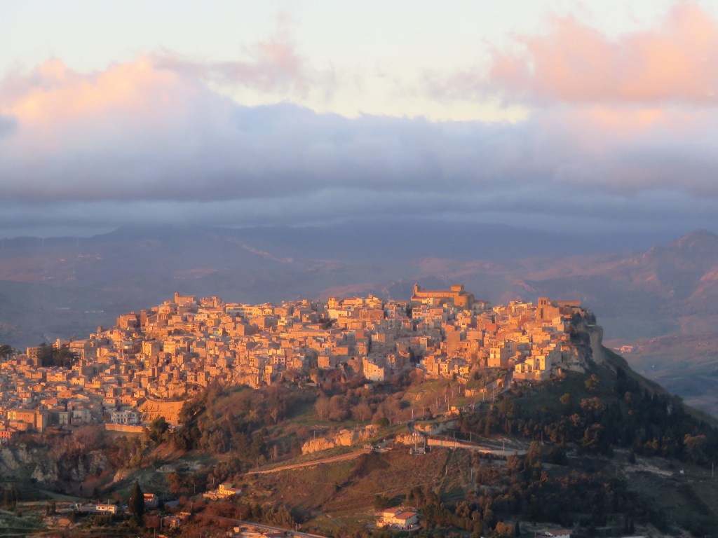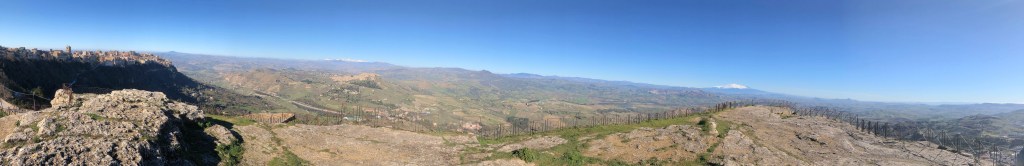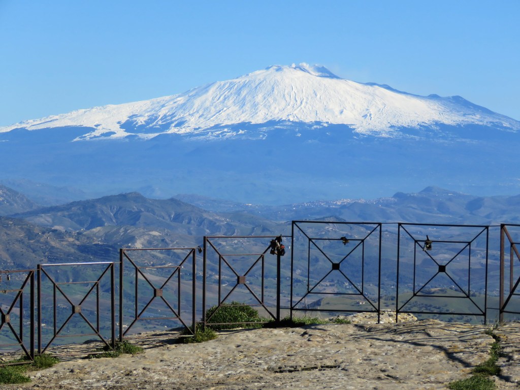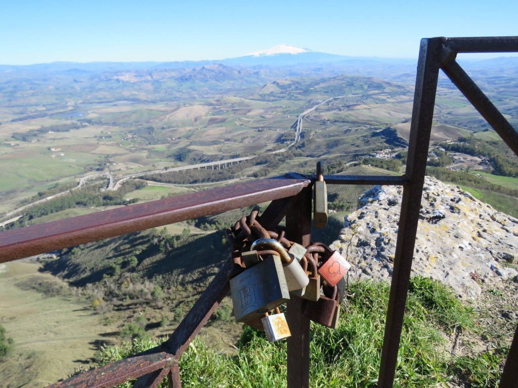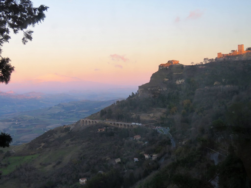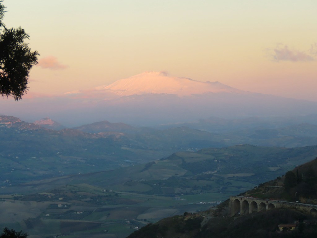 Sicily’s tallest hilltown, Enna, coincidently or fatefully, resides at the geometric center of Sicily, and according to the ancients, is the center of the Mediterranea…and the world. Settled in pre-historic times due to its commanding defensive plateau, it’s unclear if the idealized “center” also spoke of the sacredness of the place. The Torre di Frederic II marks the spot, which we attempted but failed to summit—at night—as we followed twisted back alleys ending in many dead-ends. Purists, aware of the changing, eroding shoreline now say Sicily’s center is some half a kilomter away. At the other end of the city, is the Castello di Lombardia and Rocca di Cerere upon which once stood a Greek temple to Cerce, the goddess of fertility. With its commanding 360-degree view, Etna looming large in the distance, we ask ourselves, “At what point is center a spot versus a state of mind?” I’m reminded of Galileo being accused of heresy for stating the earth was not the center of the universe.