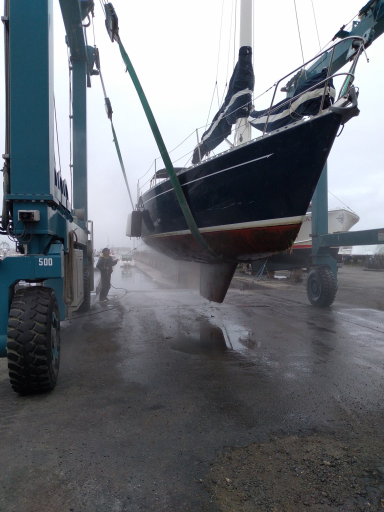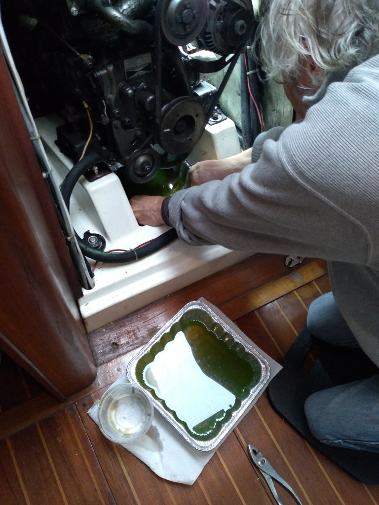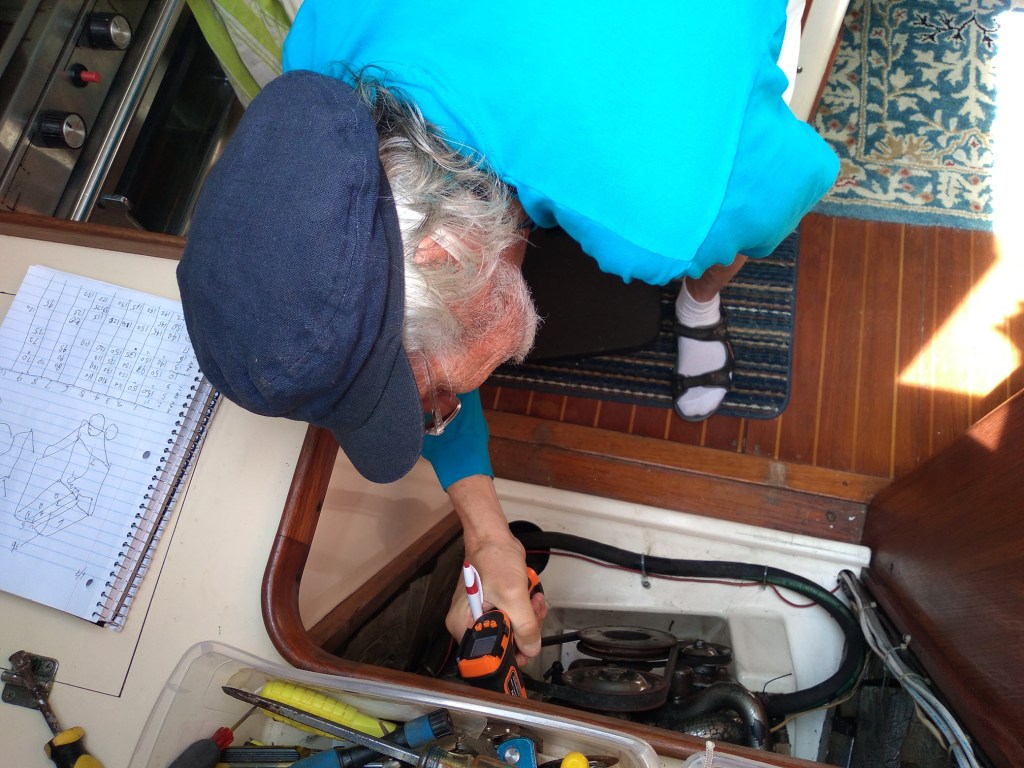 All these items back to square one and the sea cock now in the open position, we ready ourselves to motor ten minutes from the dock to the now-in-place mooring to leave the boat while we’re away on the West Coast. And wouldn’t you know it, the alarm goes on again, despite the care we had just given our poor engine, but we leave the next day and there’s no time to diagnose it. Upon our return, we run the engine a third time to haul the boat so we can clean the bottom and replace the zincs, and the alarm sounds again! The marina staff brings the boat back to our slip.