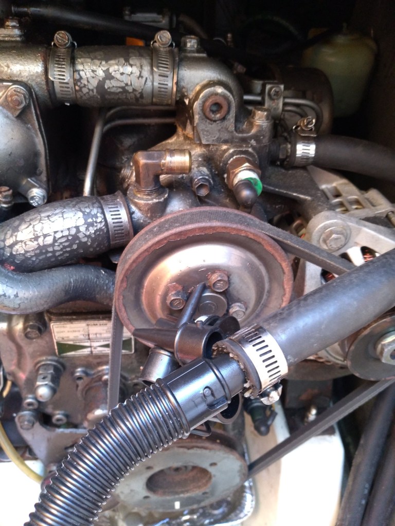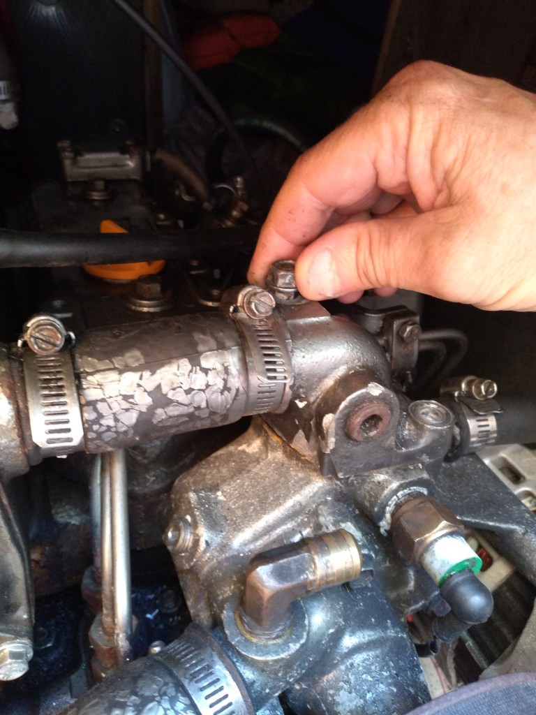 We add coolant, remove and test the thermostat, which is functioning as it should, and discover a broken seal on the radiator cap. We give it one more test, revving it up in reverse at the dock and using our new laser heat gun to test the temperature throughout the engine. No overheating! Next day we take it out circling close to the marina for 30 minutes and still no overheating.