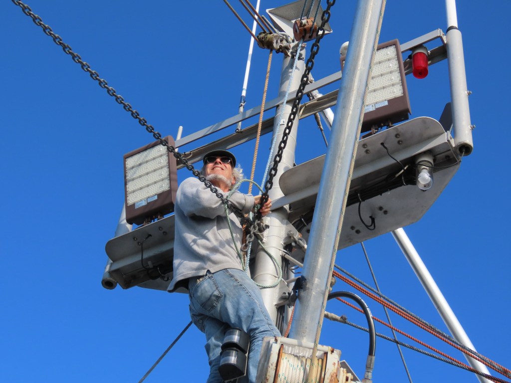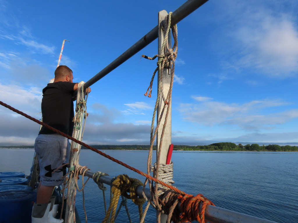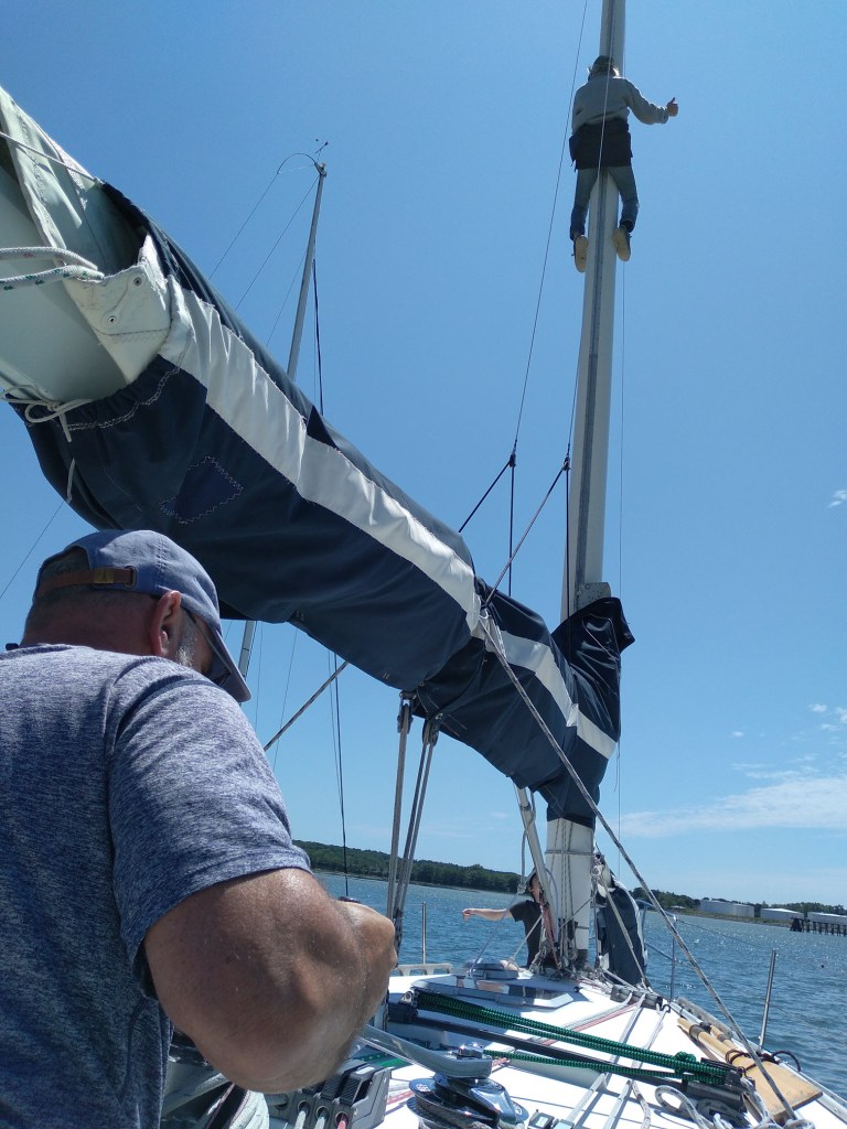As we’re raising sail on the way back, we lose our jib halyard up the mast. Damn! Next day, Will makes arrangements with Bill to meet us at Knight’s Landing in South Portland to help haul him up the mast in the bosun’s chair to retrieve it. Will was calm and steady, and I was surprisingly nerve-free despite his height of at least 35 feet up.
