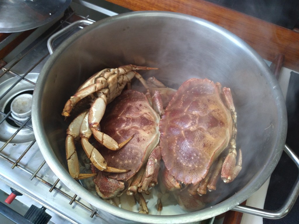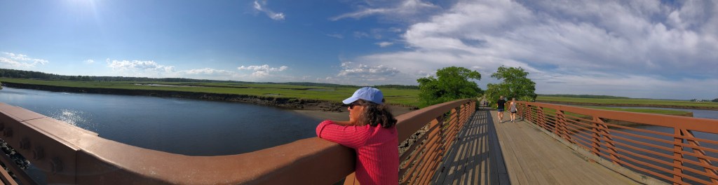 Knight’s Landing is a little hidden gem under the Casco Bay Bridge that connects Portland and South Portland where Will spent most of the summer two years ago with his former boat. The dock has a bird’s eye view of the oil tankers coming and going so has a very industrial feel and is a local haunt for those in the know, especially because you can stay overnight for free. We meet the usual cast of characters—a pair of fishermen brothers, one of whom has been living on his scrappy, demasted boat and gives us a half dozen crabs from his brother’s lobster boat; the guy who runs the South Portland Sailing School and happens to have bought our old mooring; and none other than Simon and Jill, my son and daughter-in-law, doing a Solstice sunset cruise on Jill’s boat, On the Rocks Cocktail Cruises. Jill got her captain’s license two years ago and is running her boat for the second year, this time with a liquor license.