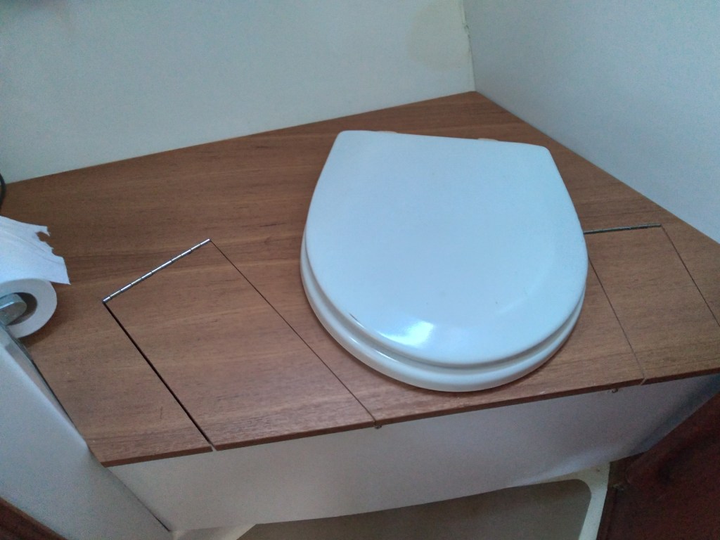 The last step is deciding what to do with the pee, which when separated from the poop doesn’t smell either, as long as you empty it regularly. Normally, composting toilets—or more accurately, dehydrating toilets—collect pee in a container that you then have to dump overboard, which, in case you’re wondering, is safe because it’s inert. In our case, after much debate, we decide to attach a hose to the diverter and plumb it directly into the waste hose below the sink, and out it goes with an electric pump. So now, we push a button to flush the pee directly overboard, along with a splash of fresh water we recycle from rinse water in the galley. What a great system! Well, except that sometimes water or pee spills over into the coffee-chafe-covered poop making it soggy. 😦 Will has since modified the diverter and extended the hose so it can hold more liquid before being pumped overboard.