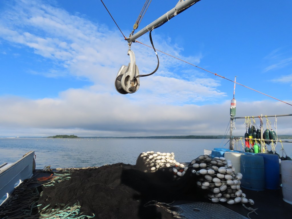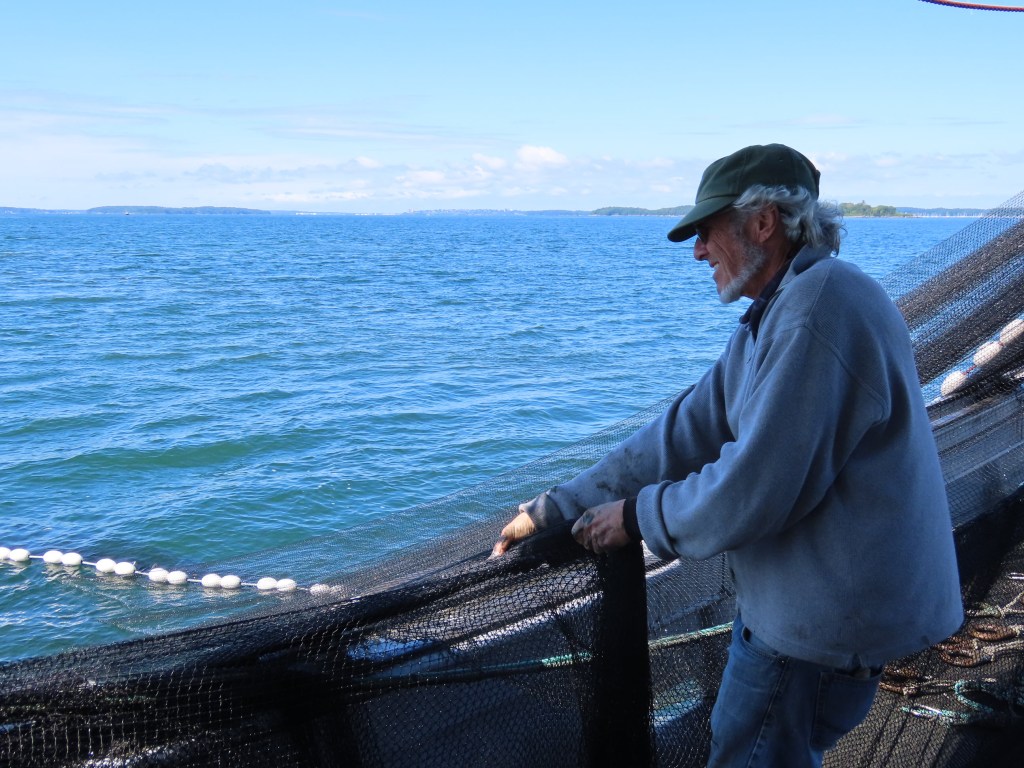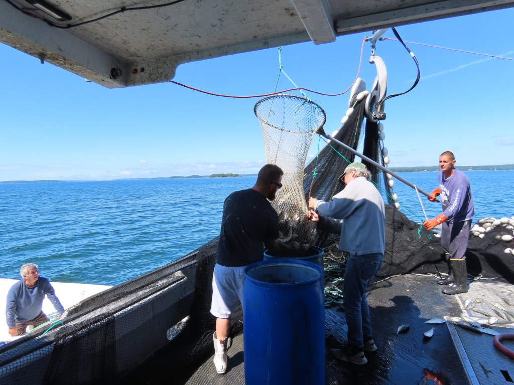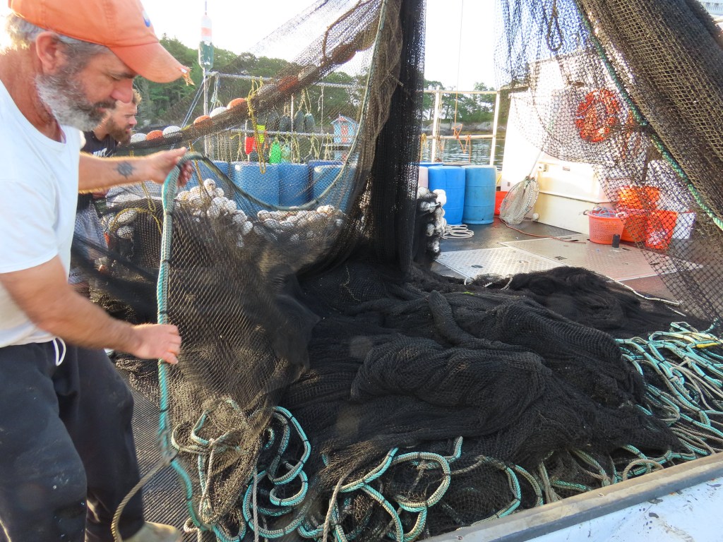 One morning we’re invited aboard the Linda Kate, a 40’ fishing boat whose captain Will got to know at DiMillo’s as he was preparing his boat for the season. In addition to lobstering, his boat is now outfitted for purse seining and scalloping to diversify his catch. His wife is one of the newest aquaculture farmers in the bay growing and harvesting sea kelp. He invites us aboard for a day of fishing and we readily accept. We wake at 5:30 AM and watch as they haul the huge net aboard for a day of pogie fishing. With two crew, Will who is willing to get his hands dirty, and me, the film crew, we have an extraordinary experience fishing for pogies, which is one of the primary bait fish for lobster. It takes a while to locate a school among the other fishing boats, but eventually he spots one based on the oily purplish water and “flips,” not to mention the seals who are circling for food. With great finesse, they drop the net being careful not to catch a foot in the line and begin to circle up the fish when the captain realizes he didn’t attach a line, so out pour all the fish! With the assistance of a hydraulic winch, they haul the net, carefully packing the floats and metal rings so it can again run free. Another hunting expedition and we regroup around the same school, set the net again, and this time, haul eight barrels, only half of the legal catch for each boat. We are regaled by his crew who is extremely knowledgeable about purse seining and lobstering and is on the verge of launching a new sustainable fishery business he’s invented for crabs, squid, and whelks. Impressive!