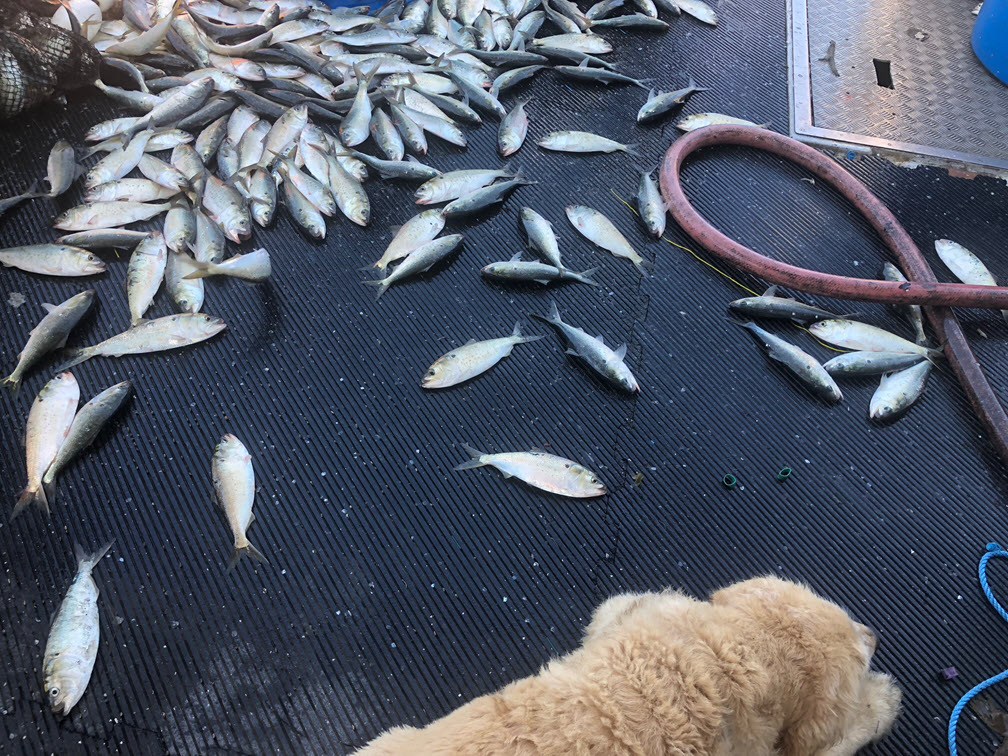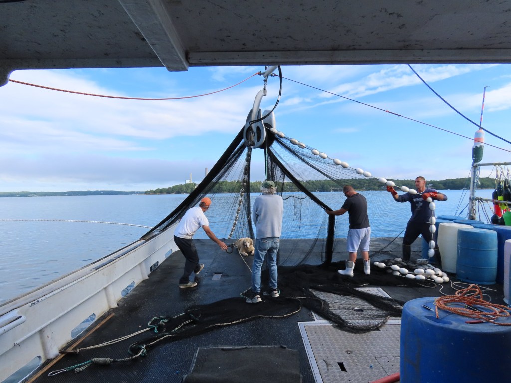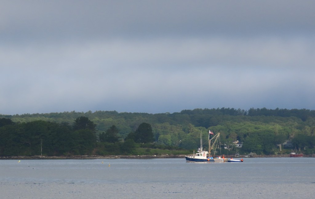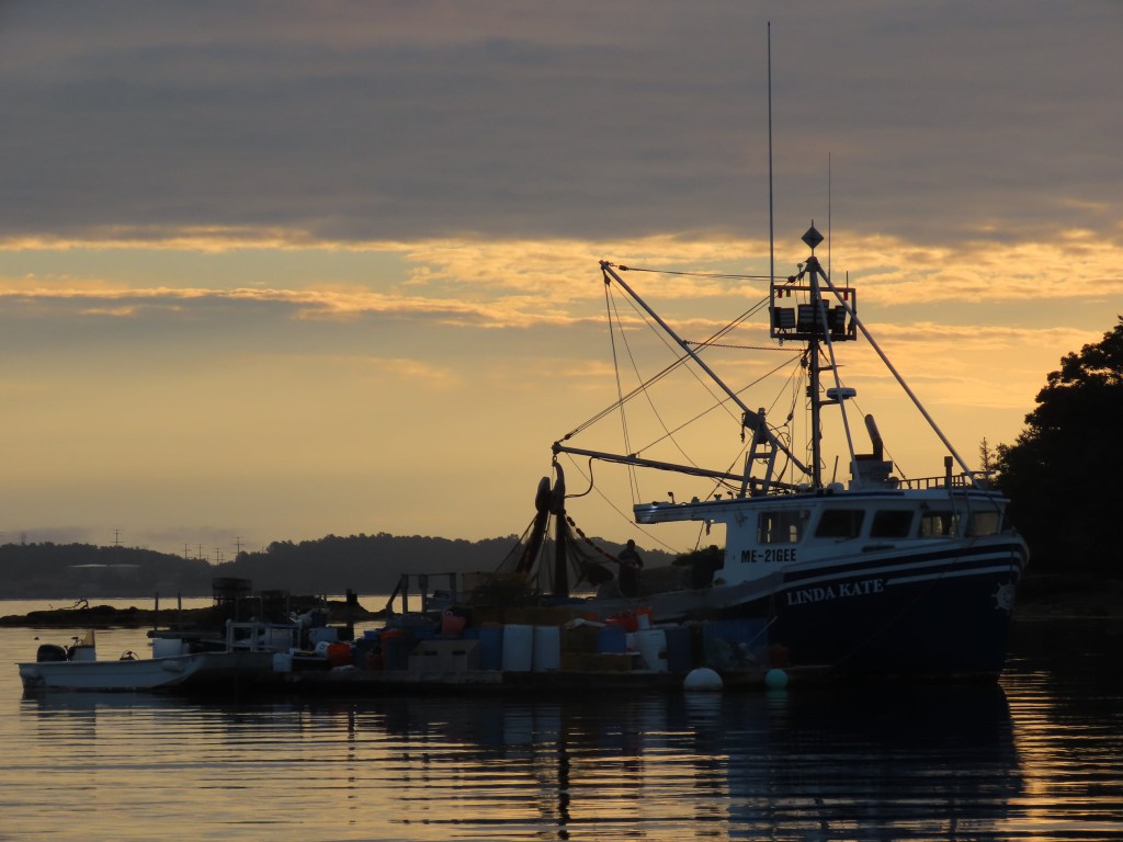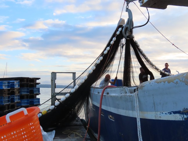 One morning we’re invited aboard the Linda Kate, a 40’ fishing boat whose captain Will got to know at DiMillo’s as he was preparing his boat for the season. In addition to lobstering, his boat is now outfitted for purse seining and scalloping to diversify his catch. His wife is one of the newest aquaculture farmers in the bay growing and harvesting sea kelp. He invites us aboard for a day of fishing and we readily accept. We wake at 5:30 AM and watch as they haul the huge net aboard for a day of pogie fishing. With two crew, Will who is willing to get his hands dirty, and me, the film crew, we have an extraordinary experience fishing for pogies, which is one of the primary bait fish for lobster. It takes a while to locate a school among the other fishing boats, but eventually he spots one based on the oily purplish water and “flips,” not to mention the seals who are circling for food. With great finesse, they drop the net being careful not to catch a foot in the line and begin to circle up the fish when the captain realizes he didn’t attach a line, so out pour all the fish! With the assistance of a hydraulic winch, they haul the net, carefully packing the floats and metal rings so it can again run free. Another hunting expedition and we regroup around the same school, set the net again, and this time, haul eight barrels, only half of the legal catch for each boat. We are regaled by his crew who is extremely knowledgeable about purse seining and lobstering and is on the verge of launching a new sustainable fishery business he’s invented for crabs, squid, and whelks. Impressive!