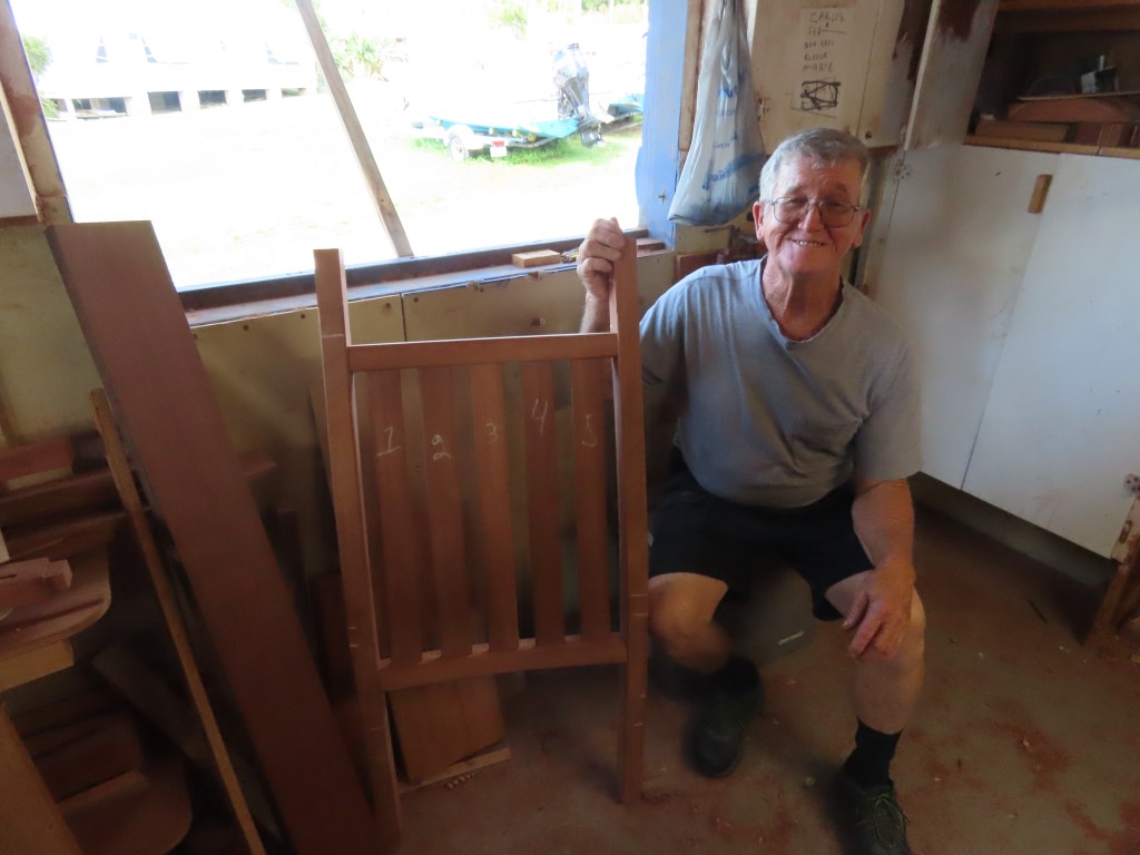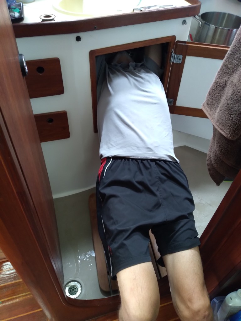 We’ve repaired the rudder, which had too much play from day one and involved removing the steering quadrant, dropping the rudder, modifying and refitting the bushing, and replacing the rudder and quadrant. How, you might ask do you “drop” the rudder with its long rudder stock? The first time, the travel lift lifted up the boat. The second time, Will dug a hole under the rudder in the gravel! “Caribbean style, mon,” according to our neighbor Steve. We’ve sanded and painted the bottom, and raised the waterline so we have less visible marine growth. At Paul’s recommendation, Ethan the mechanic replaced the worn propeller shaft, replaced our dripping stuffing box with a dripless shaft seal, and replaced the raw water intake thru hull and strainer with a larger one. All this means no more water in the bilge where you don’t want it and more water going through the engine where you do. We’ve installed a temperature gauge and replaced the worn wire from the engine to the batteries. And if all that wasn’t enough, Will, the dear, removed the head holding tank and is replacing it with a tank of the exact same size that just happened to be hanging around Paul’s shop. His shop just happens to have parts like custom bearings and mastheads, and doors and antique faucets that fit our boat and which he is happy to be rid of, so we couldn’t have gotten work done at a better place. The used watermaker which had no backstory miraculously worked on the second try, and the new water tank is perfectly sized to take up no existing storage space. It will hold the fresh water that we will be making using reverse osmosis that turns salt water into fresh! Friends tell us it’s a game changer as it means less worry about running out of water and more showers!