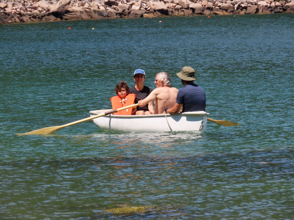 Next morning, a large megayacht pulled into our anchorage, so we took that as a sign it was time to move on. After a quick detour in Southwest Harbor to fill our water tanks and walk to town for lunch and some provisions, we were off again. As promised, we took a detour to Duck Cove to visit the family we met over a fish sandwich to show them our boat. We rowed them out, shared a bowl of peanuts and some sparkling rose, and gave them a tour. Theo especially enjoyed counting the number of cabinets, drawers, and cubbies in the boat: 48! He also instructed us on what a tardigrade was—a near microscopic aquatic animal that can survive in almost all environments. A note for all ears: If we can keep this level of curiosity and wonder alive in our souls, we will live happily, like a child. Please remember this!