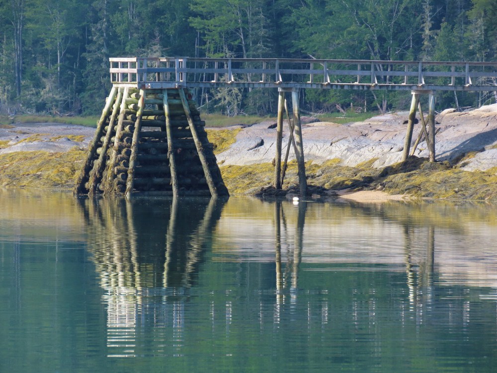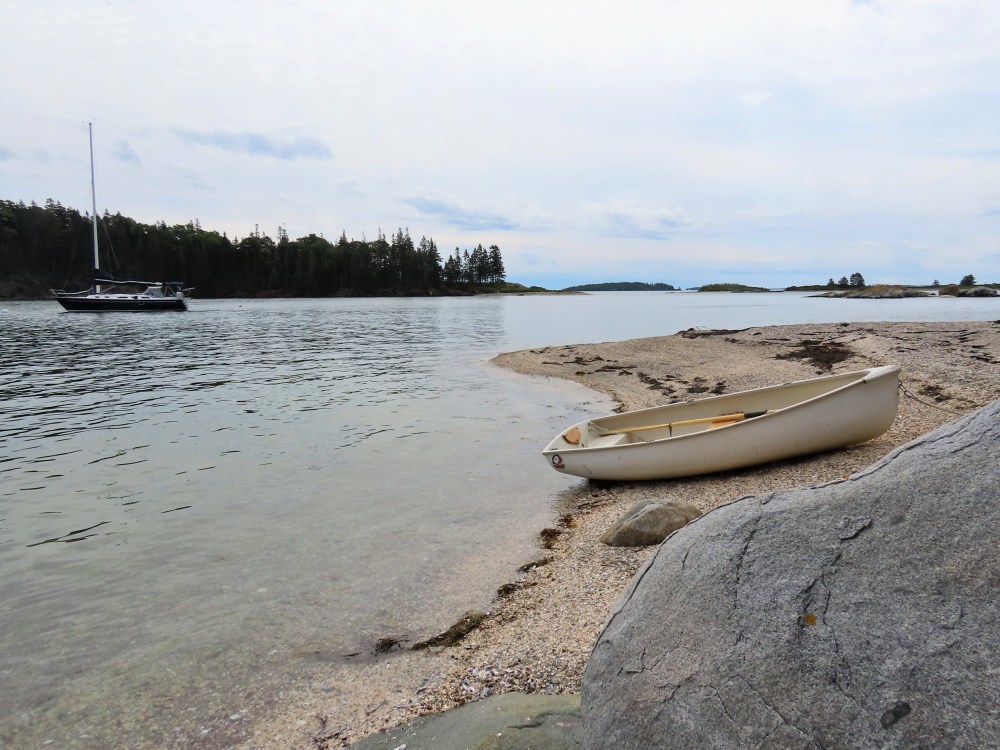 Cruising up the Eggemoggin Reach and under the Deer Island bridge was a thrill, then making our way past a seal-covered rock into Horseshoe Cove was equally delightful. At low tide, we rowed ashore to forage for mussels and once again came back with a bucketful. Despite the doomsayers who are convinced the green crabs have eaten all the Maine mussels, we haven’t found that to be the case. Although this small harbor was full of sailboats on moorings, no one was aboard so we had the place virtually to ourselves, allowing a cockpit shower from our Sun Shower and dancing on deck. Life is good!