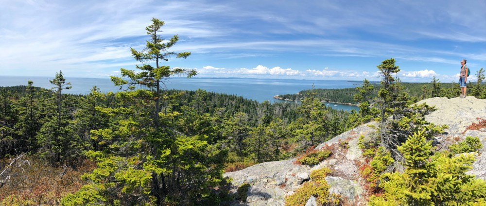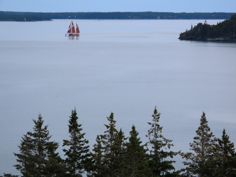 After four days Down East, we headed back to Southwest Harbor in a light southwest wind with 3-5 foot seas, motoring nine and half hours the whole way. It was good to know the boat could do it, but more importantly, that we could do it. Exhausted, we picked up a mooring and took a nap, then motored a short way up Somes Sound to the beautiful Valley Cove, with its hundred-foot rock face. Once again, we encountered the American Eagle schooner, as well as a number of other boats. The hike up Flying Point Mountain the next day was delightful, complete with blueberries and an international crowd of hikers at Acadia National Park. A delightful Colombian family with a young son was deeply intrigued with living aboard, so Will rowed them out the see the boat and make it real for them. Lingering for another day, we were once again the lone boat for a magical spell as we dove deeper into The Overstory by Richard Powers, winner of the Pulitzer Prize for this outstanding book where trees are the heroes. Spending so much time immersed in nature these past months has given us a deeper appreciation for this magnificent book than we might otherwise have had. We highly recommend you read it if you haven’t already.