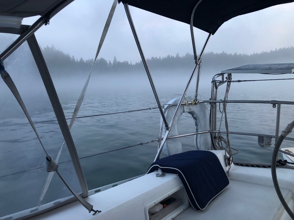 The ten miles to Roque was easy after the previous sail. We arrived at the huge cove with a mile of sand beach and a number of other boats, so this remote island didn’t feel all that remote after all. We rowed ashore for a walk on the beach, which ended up being a long lesson in humility after getting doused by a wave over the stern of the dinghy and digging deep to get over myself. It was yet another opportunity for deep communication about mutual respect for our differences. Despite resetting our anchor to be more inshore, the swells resulted in a rolly night, so we decided to leave the next morning in the fog for a nearby anchorage. Rounding the corner, we encountered high winds and rough seas, so we retreated to Bunker Cove, a tiny protected inlet where Patriot ships took refuge from the British during the Revolutionary war.