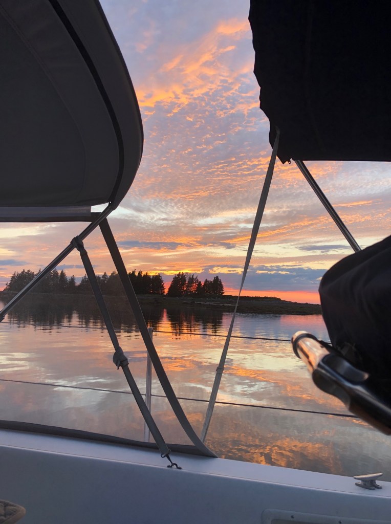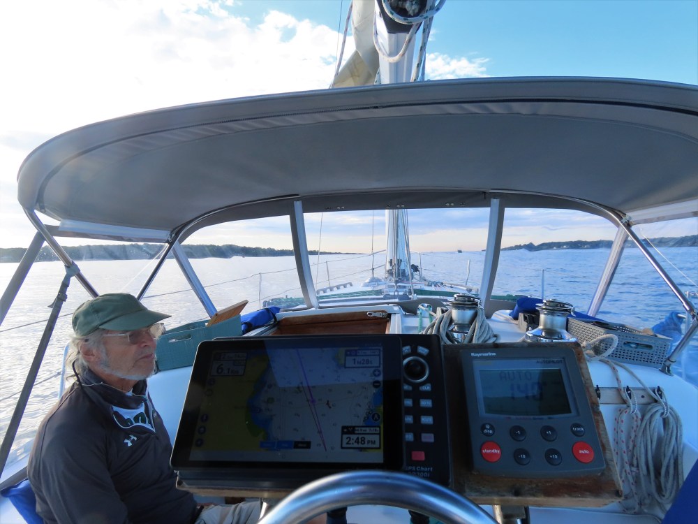 After the island, we spent another couple of days on the dock in Belfast with Sandy, enjoying this small town. Finding it somewhat difficult to leave, we had a farewell dance and picnic on the dock and boat deck before heading out. Sometimes, it can get a bit too “comfortable” being tethered in one place, and both we and the boat kept whispering, “It’s time to go sailing!” And this time, we had a new crewmember—Ray, our new Raymarine wheel drive for our autopilot, which came in the mail back in Portland and Will installed in Belfast. Ray works like a dream, and we’re continually testing him in different wind and weather conditions. So far so amazing. Now we can both eat our salad in the cockpit at the same time while underway, and we can spend our time dodging lobster pots with a touch of a button. We’re very happy!