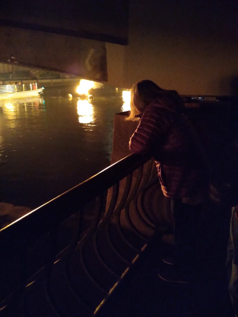 Groups, families, and couples sat on blankets and chairs, bundled in hats and coats, which were insufficient to keep us warm at the water’s edge, despite the earlier temperatures in the sixties. Kids ran around and kicked balls as the moon eased its way across the sun without our notice. I didn’t have glasses, but my neighbor blanket said I could borrow theirs, and to my surprise, I saw that the moon had already begun to cross the path of the sun. Another blanket neighbor had made a camera obscura, which they offered a glance into. A mother with three kids had also made one out of a long tube, which projected a much bigger crescent-shape onto the tube’s round end. The coolest projection of all was through the lens of a colander, which produced dozens of tiny crescents huddled in groups on the blanket below, much like the gathering on the lawn.