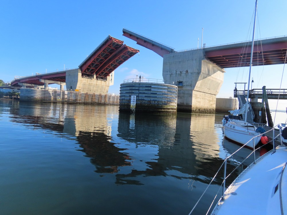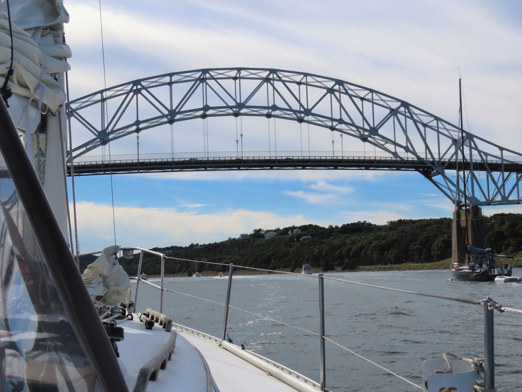 Day 3 was another day of motoring along the Massachusetts coast to the Cape Cod Canal, where we arrived at precisely slack tide, as planned, and saw 8.5 knots as we approached Buzzards Bay as the current turned in our favor. Our overnight anchored off the beach in Woods Hole was delightful, including a fantastic meal at a local restaurant. On Day 4, the winds allowed us to mostly sail across Buzzards Bay to the Sakonnet River in Rhode Island, then a downwind leg up the river to an anchorage called Fogland. Rain was predicted for the next day but held off long enough for us to motor the last leg, under two bridges, past Bristol, to the head of the river to Warren River Boat Works, which would be our home for the next month. Forgive my redundancy, but I’m strangely fascinated by all the lighthouses along the coast, which have guided mariners for centuries, as well as the audacity and ingenuity of man to have engineered and built so many bridges that span so many bodies of water.