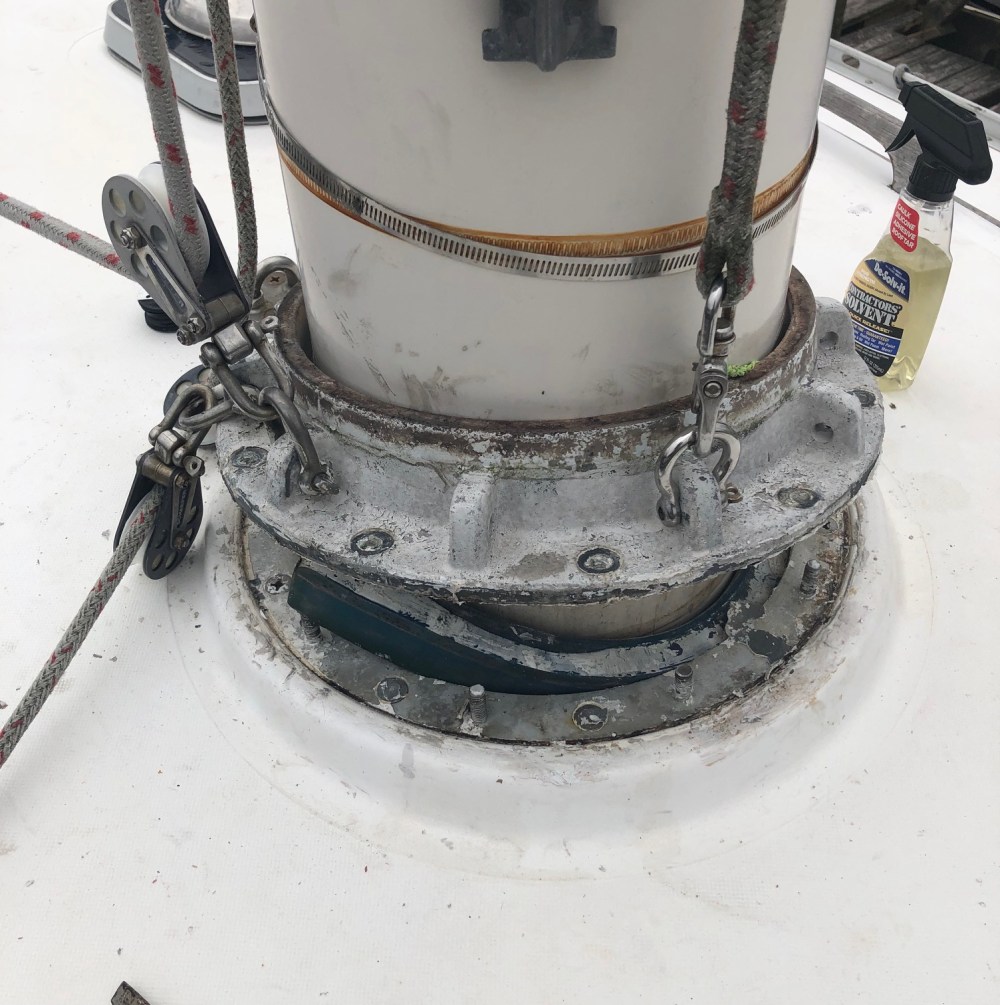 Will whacks away at the fitting at the top of the mast, which we’re replacing with and upgraded style