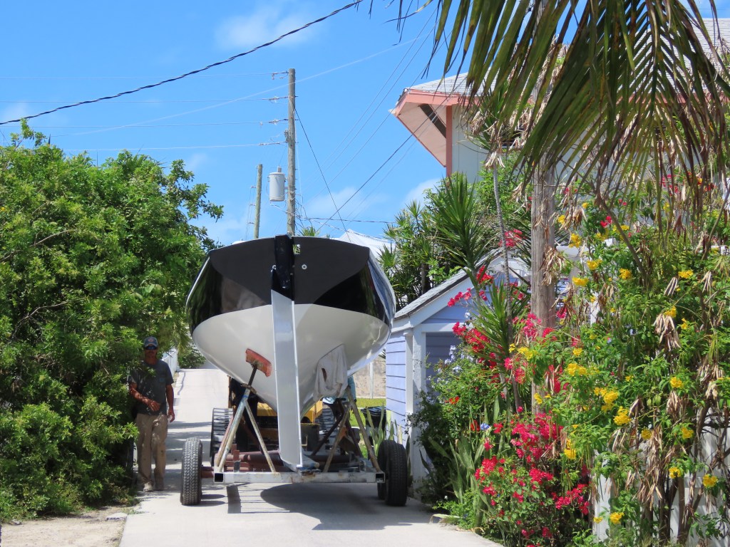 The Bahamian National Champion’s sloop being wheeled down the road on its way to the major regatta in George Town