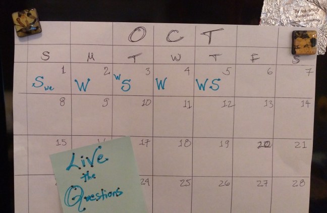 As such, part of my reinvention is the process of actively discovering, uncovering, and recovering what feeds my soul. Connecting with and supporting friends and family—including a new granddaughter—feels important. Allowing, trusting, and making time for my inner sense of wisdom to flow outwardly also feels important—witness, this blog. Exploring my creativity in ways that I haven’t had time to previously is up there. And prioritizing my physical well-being has become increasingly important—witness the calendar I now have on my fridge that tracks how many times I actually move my body each week.